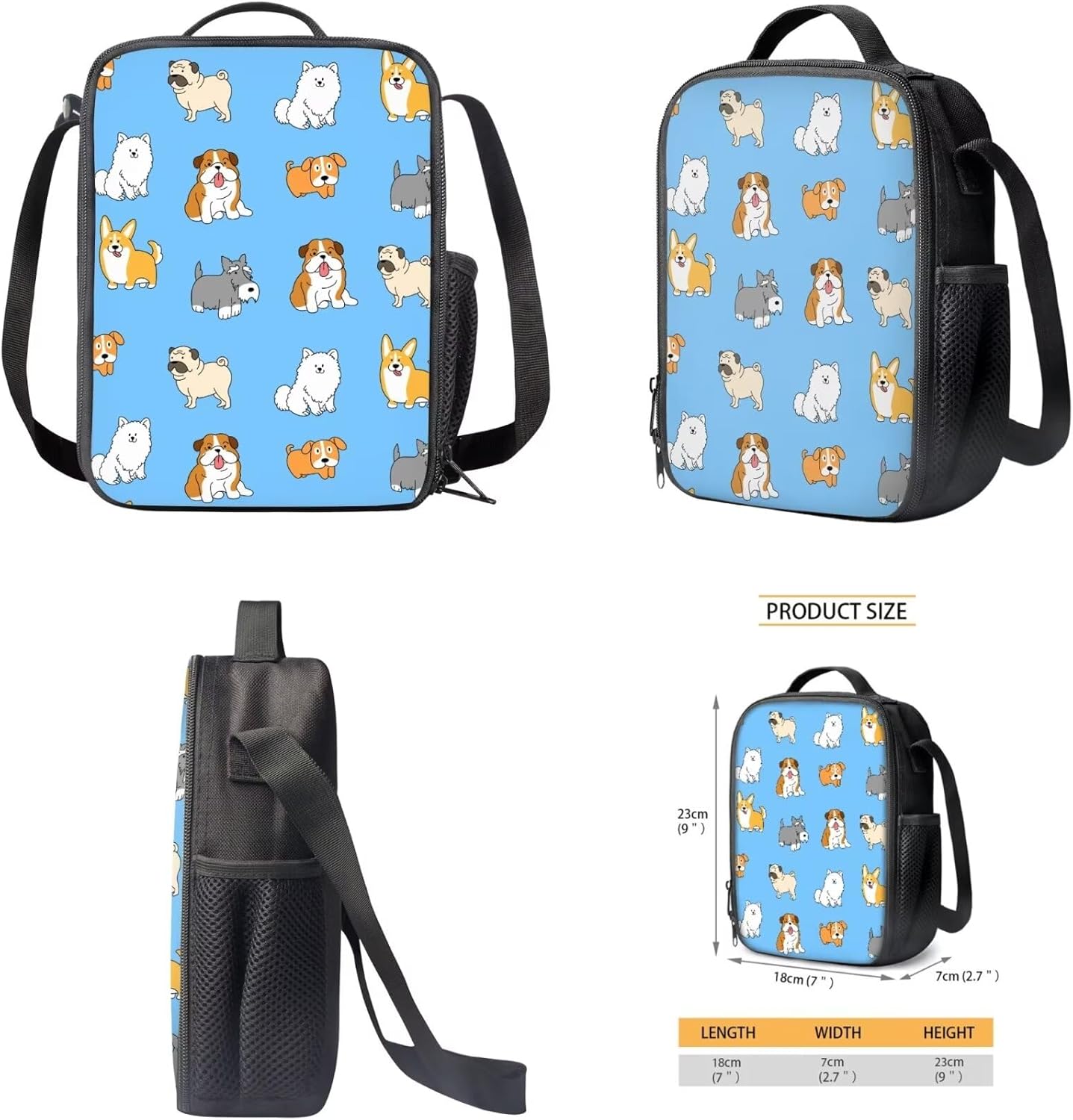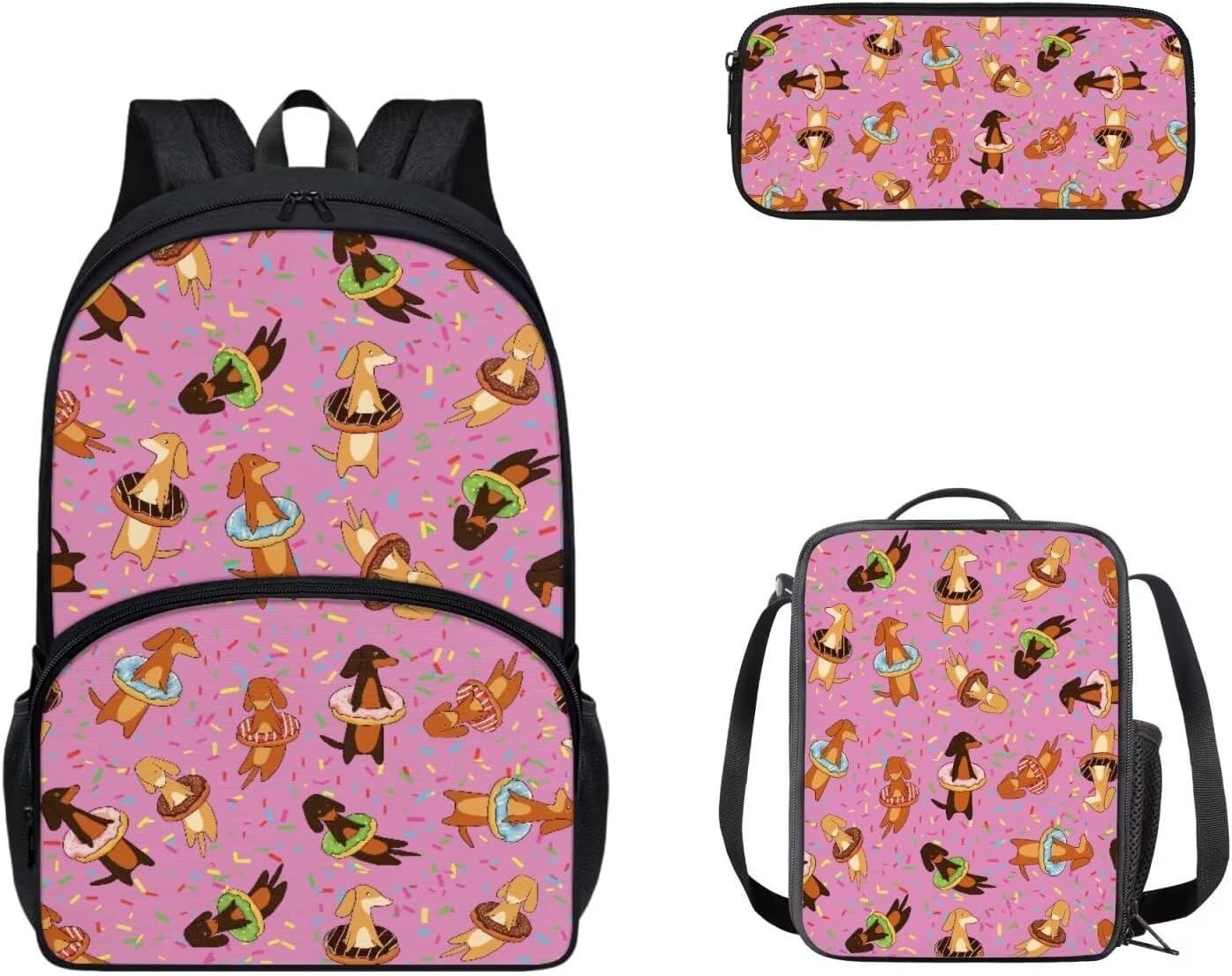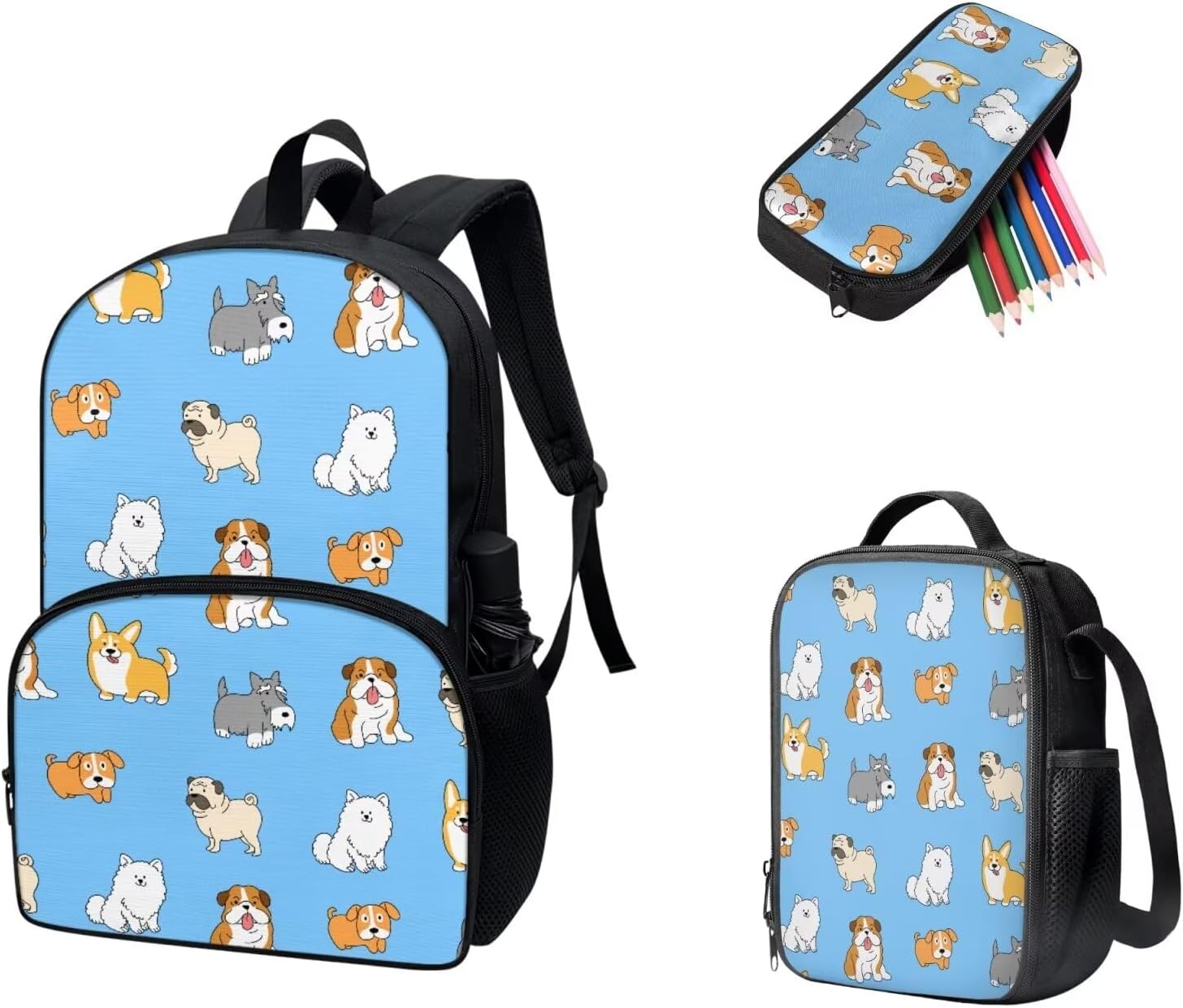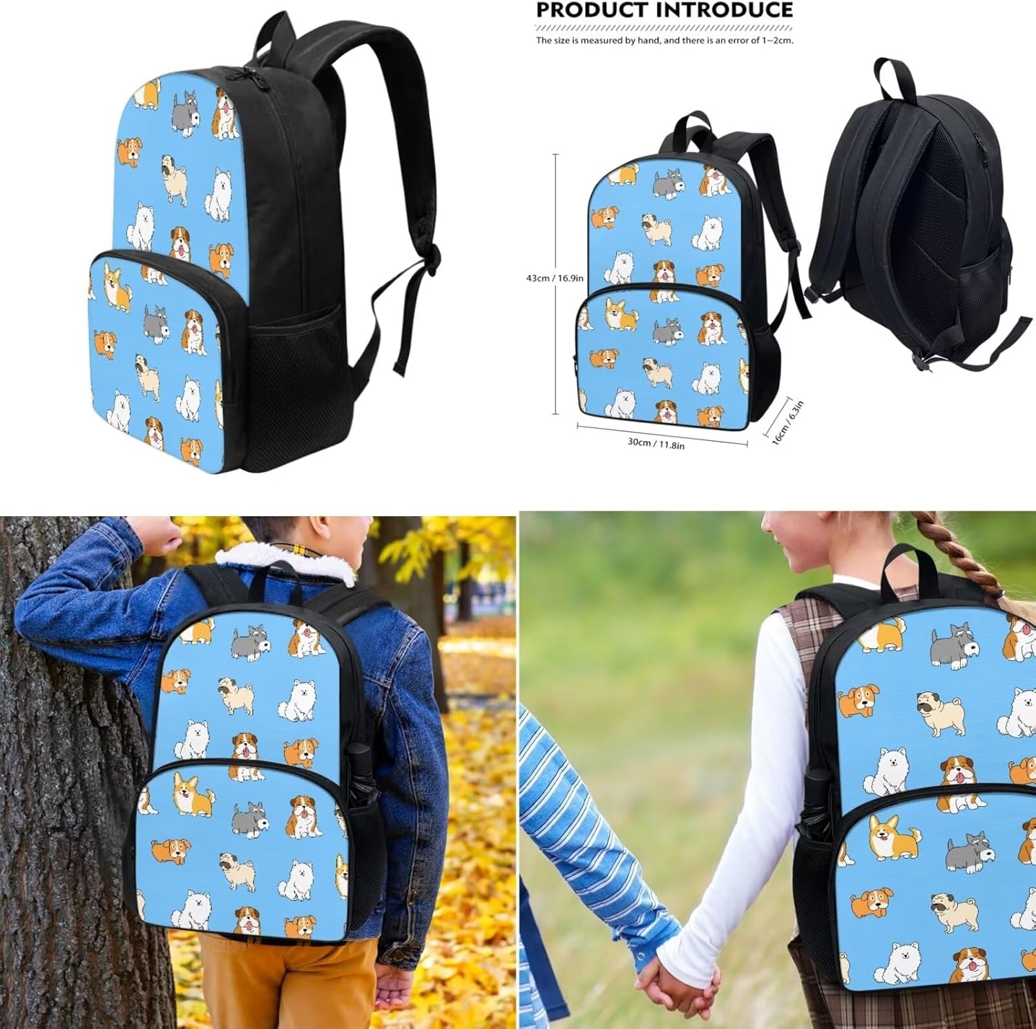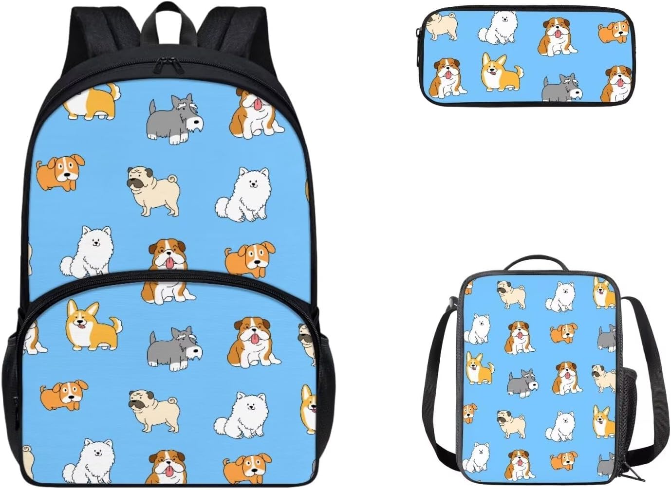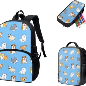doginthehole School Backpack for Girls Boys 17inch School Bag Kawaii Dogs Pattern Bookbag 3 in 1 Set with Lunch Box and Pencil Bag Cute Animal Print