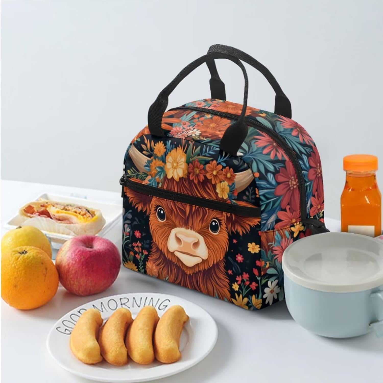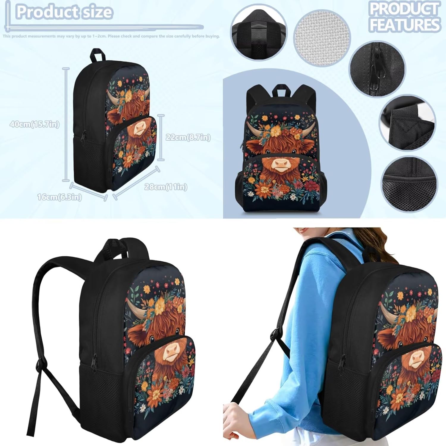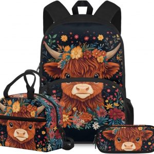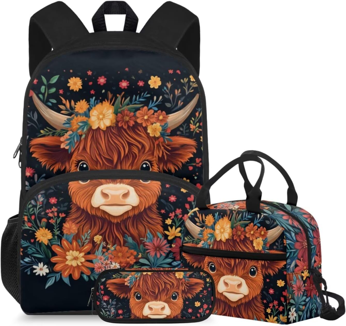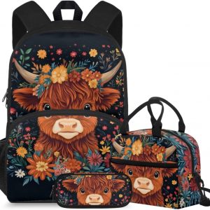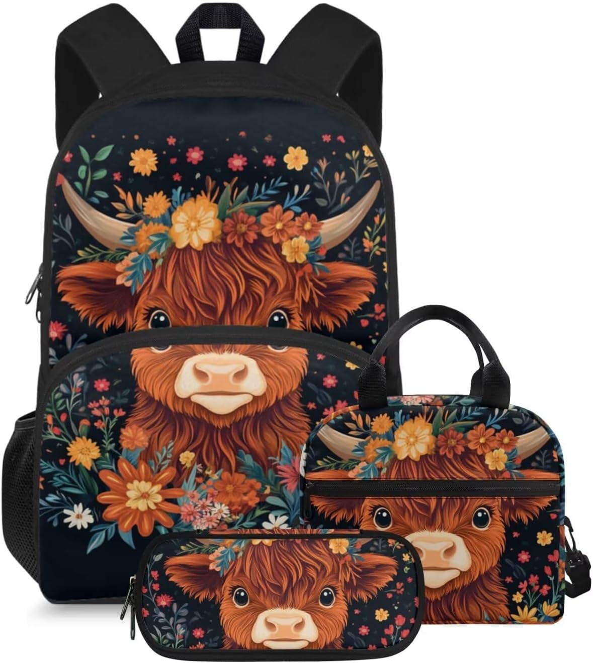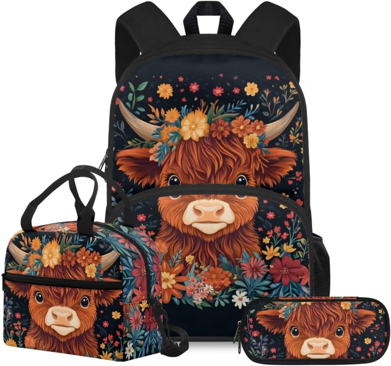 FOR U DESIGNS Girls Highland Cow School Backpack Set 15 Inch Lightweight Cartoon Bookbag with Lunchbox for Ages 6-8 Kawaii Kindergarten School Bag 2nd Grade