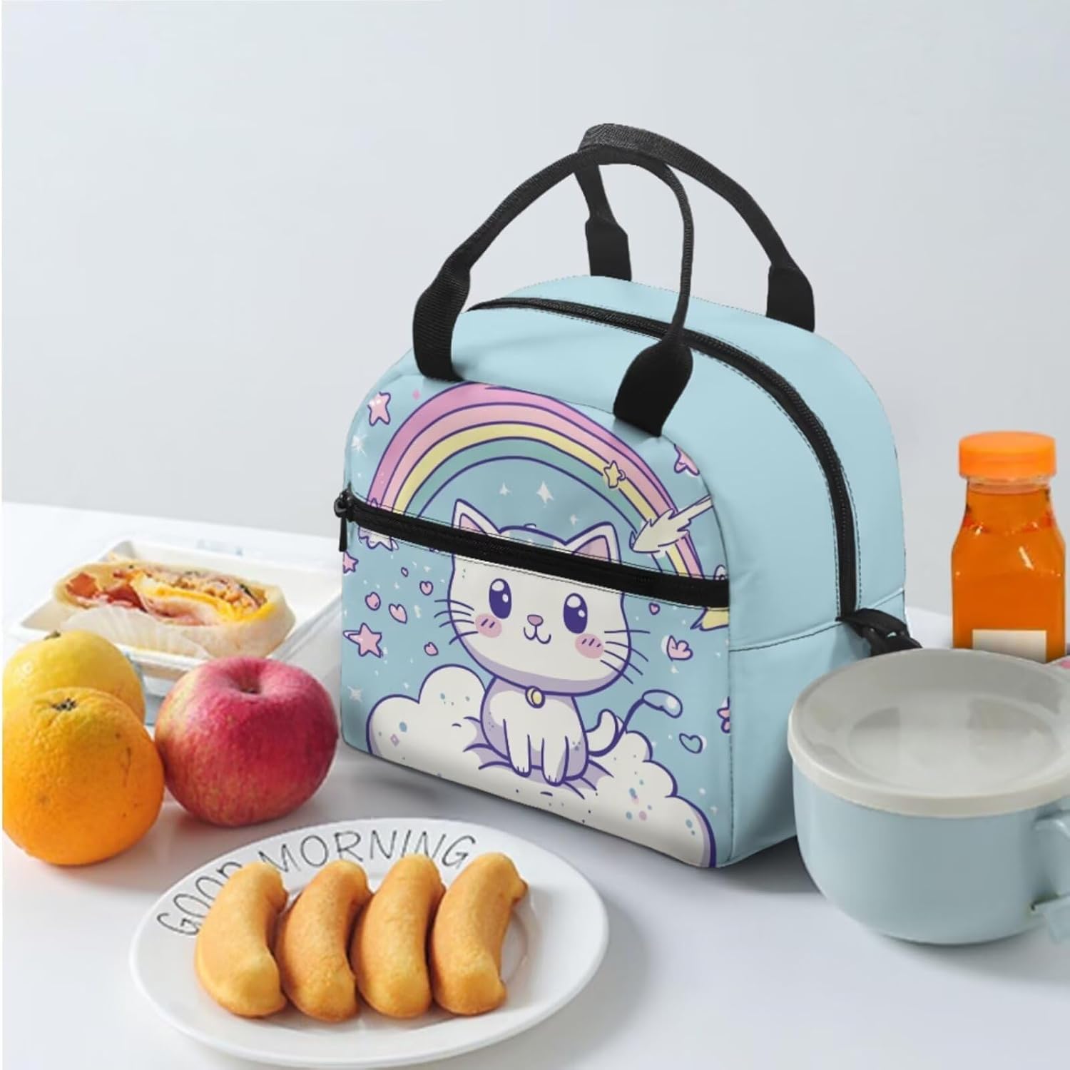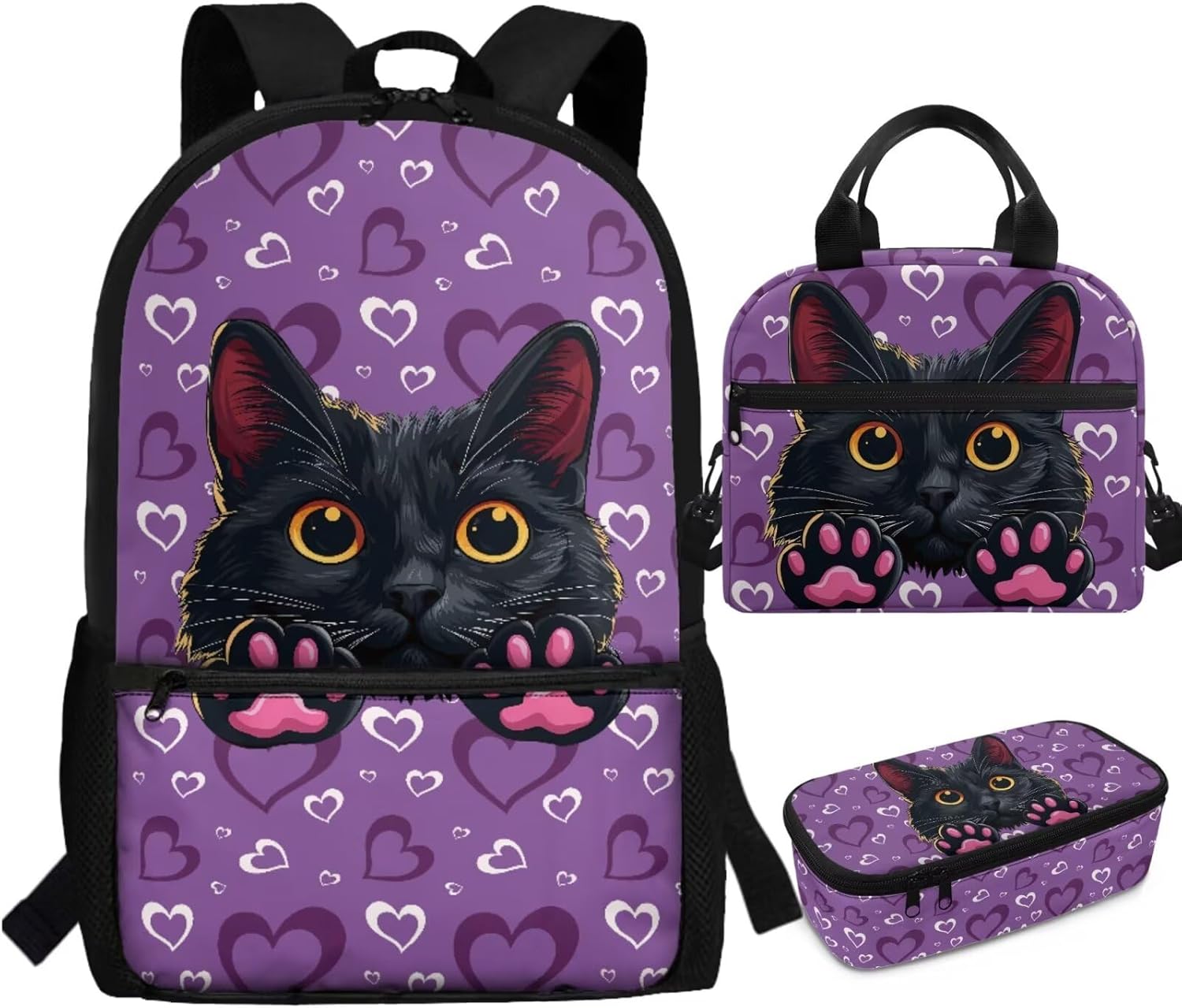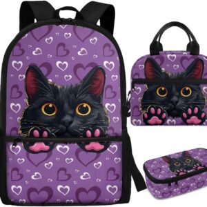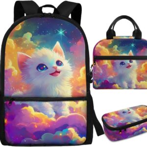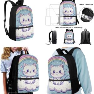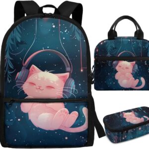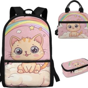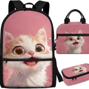 FOR U DESIGNS Kawaii Cat Pattern Backpack with Insulated Lunch Bag Zipper Pouch Ergonomic 17 Inch School Bookbag for Grade 3 Lightweight Backpack for Girls 8-12