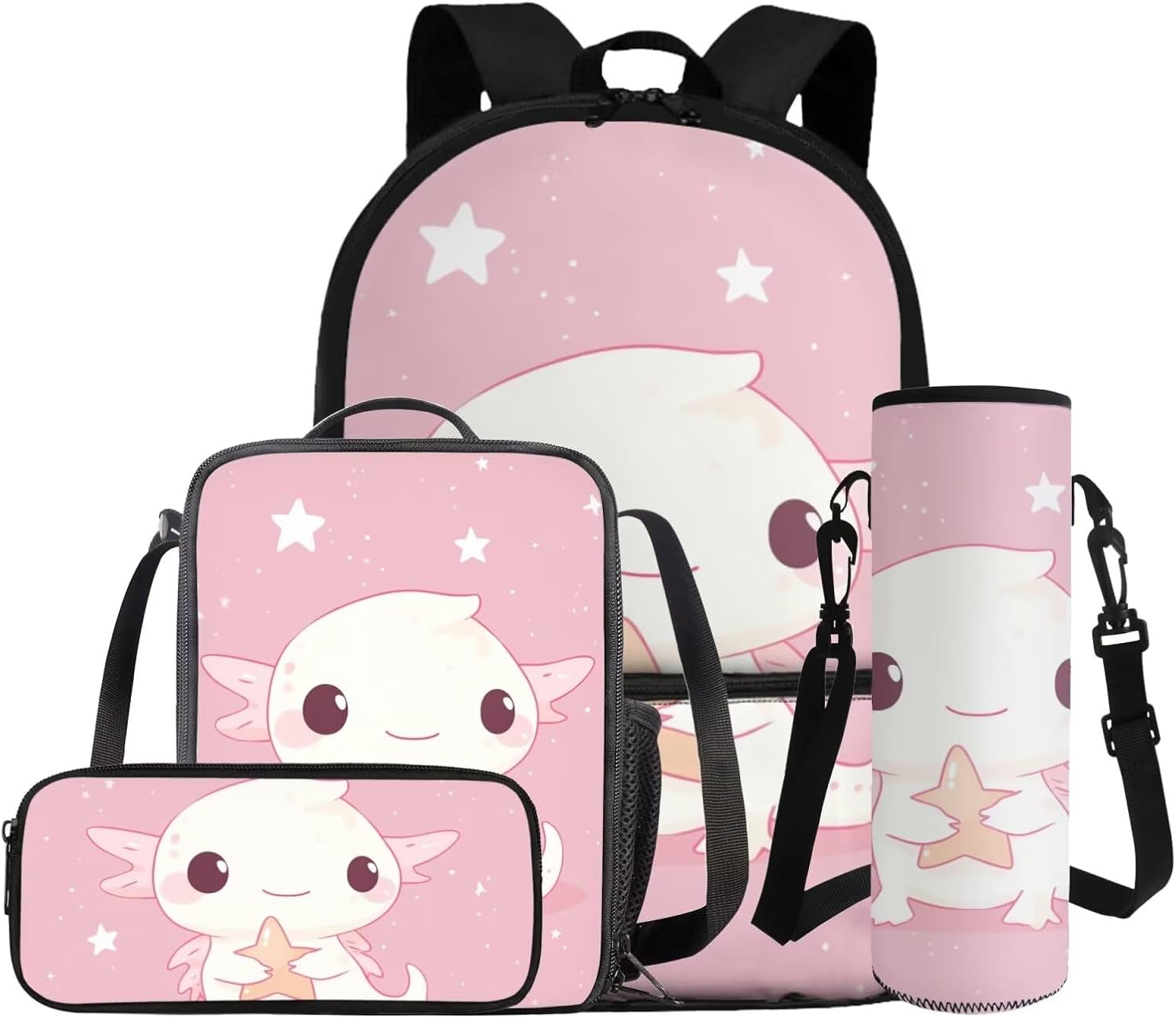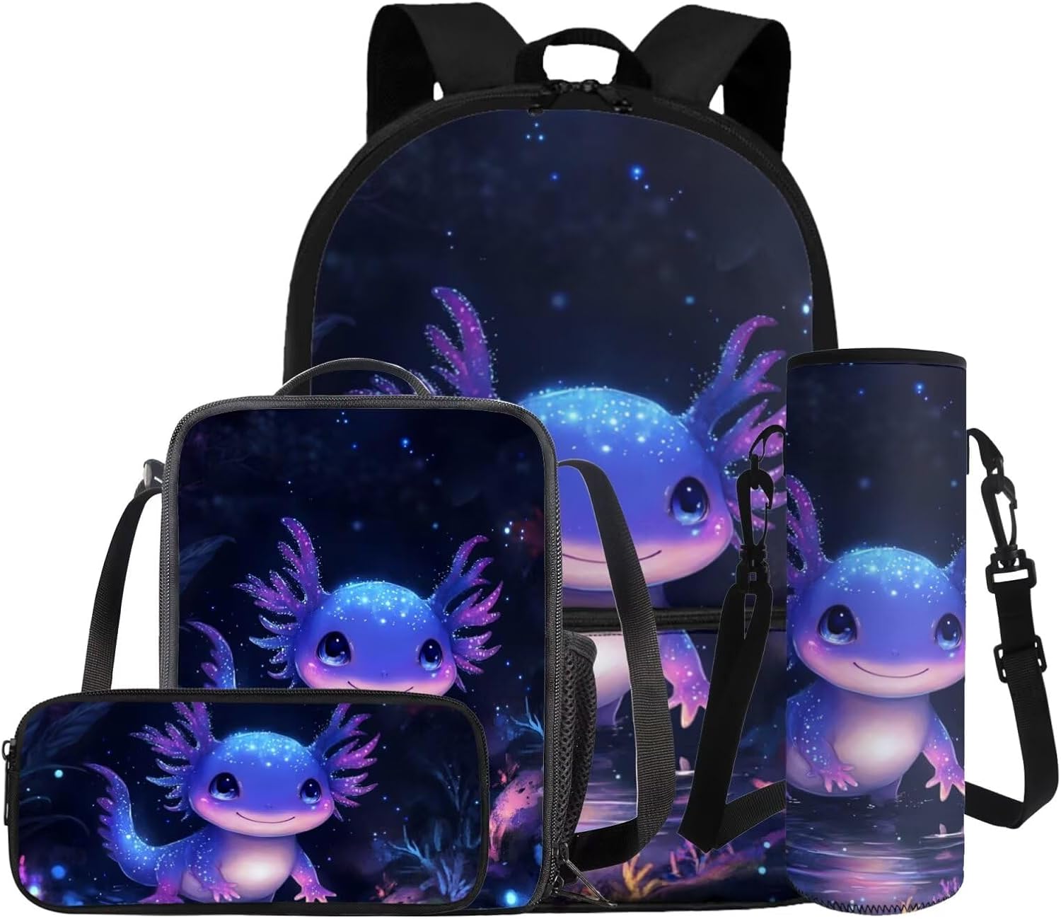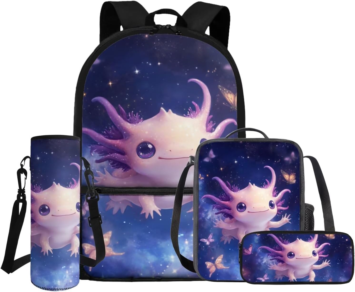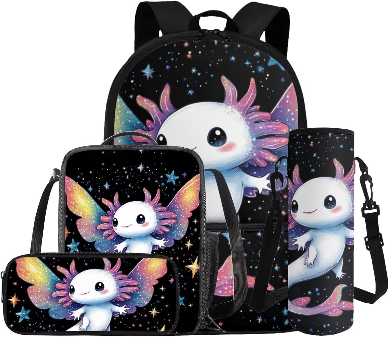 Glorowreny Axolotl Backpack Purse 17 Inch Starry Sky Bookbag and Lunch Box Set for Girls 4 in 1 Pratical Kawaii Camping Lunch Bags with Side Drink Pocket