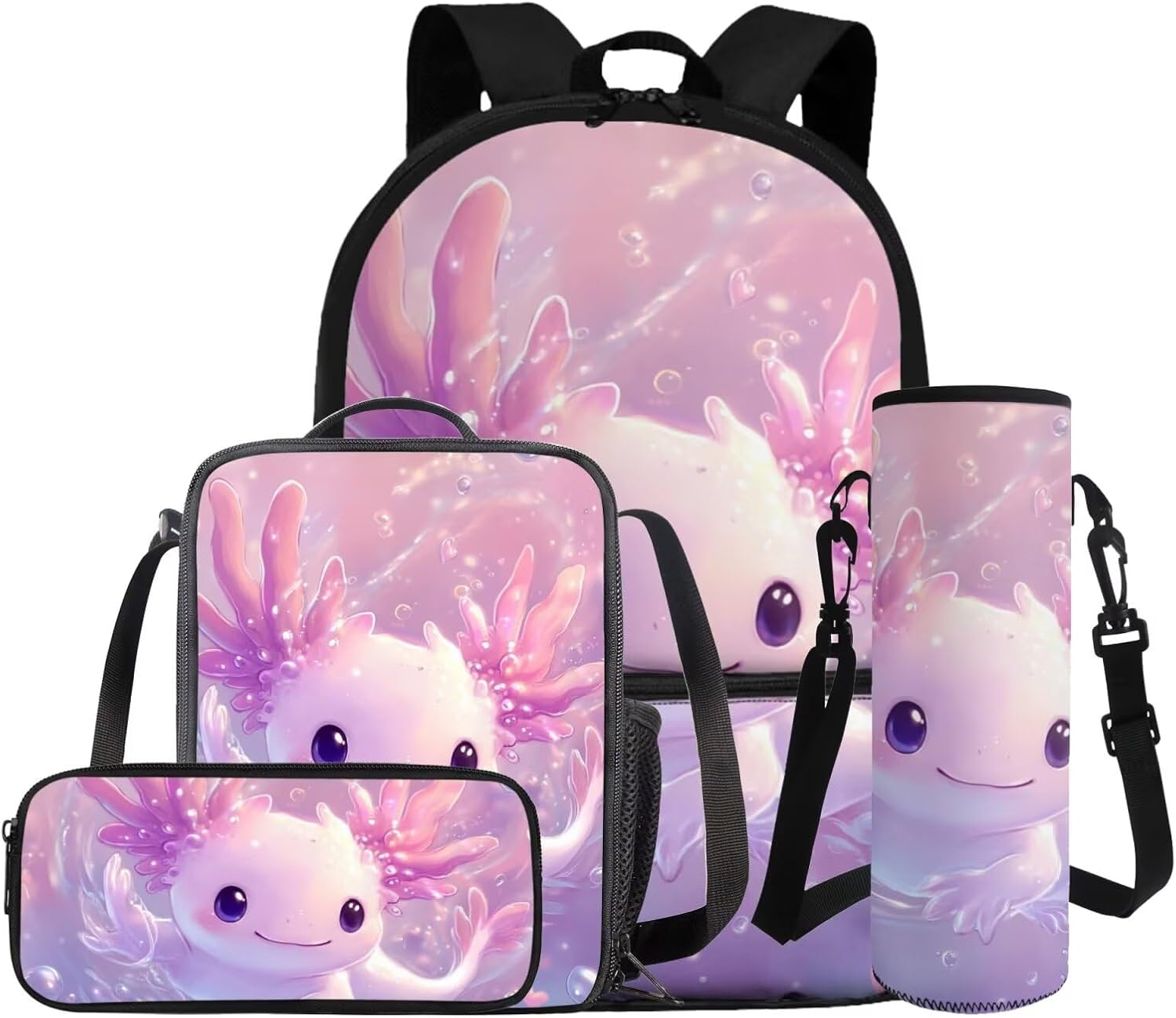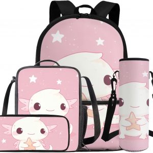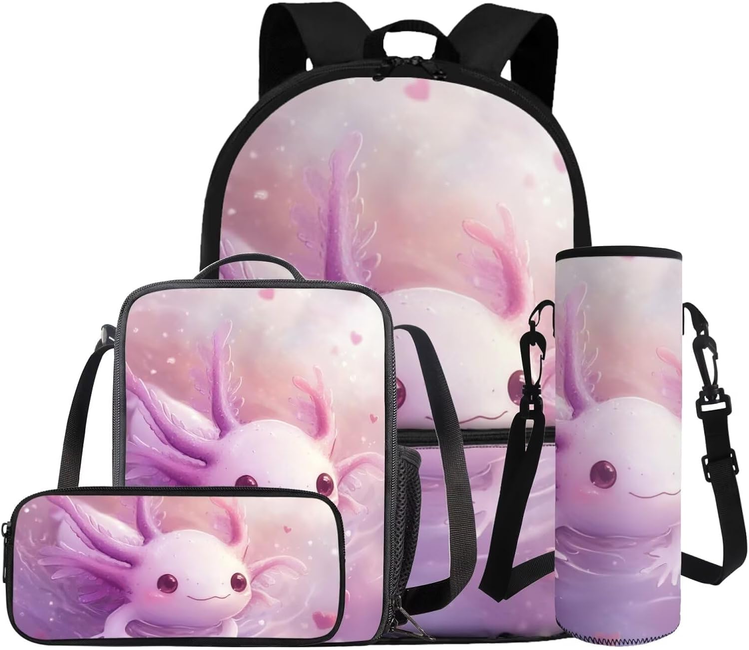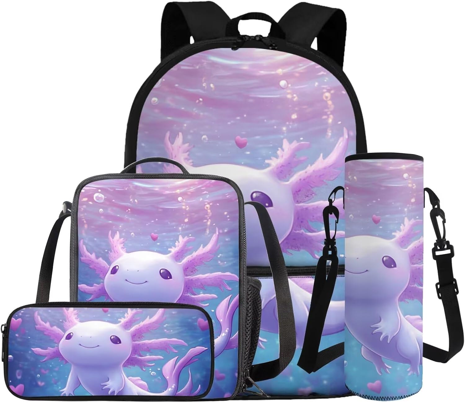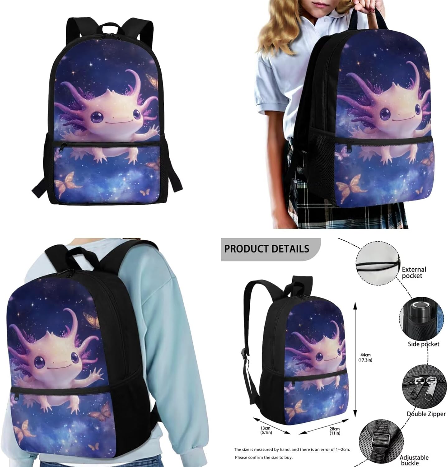 Glorowreny Axolotl Backpack Purse 17 Inch Starry Sky Bookbag and Lunch Box Set for Girls 4 in 1 Pratical Kawaii Camping Lunch Bags with Side Drink Pocket