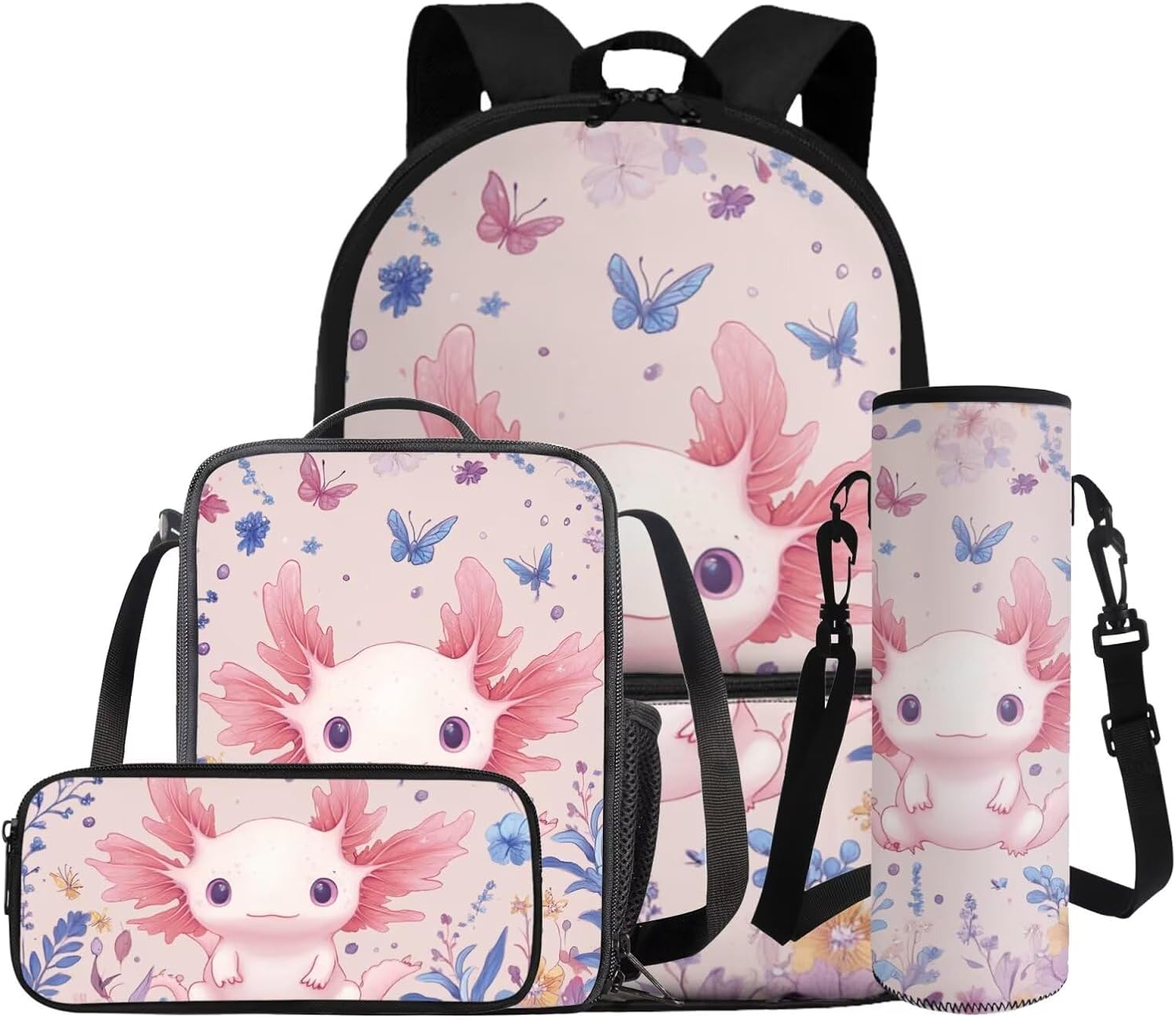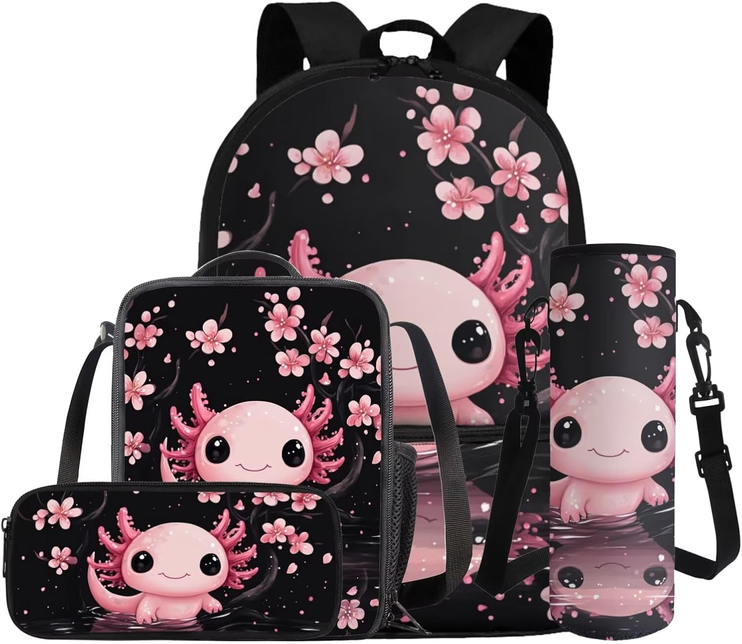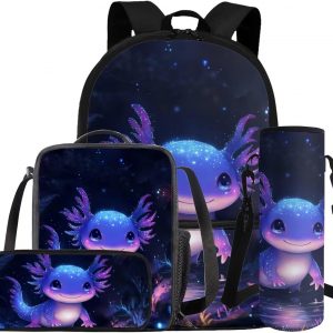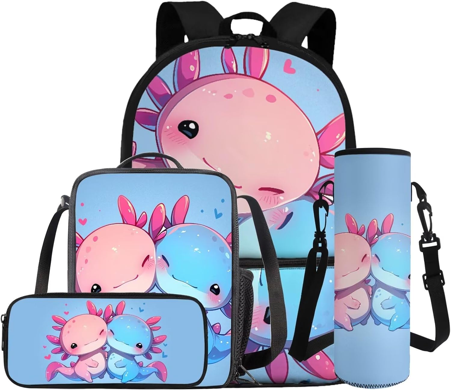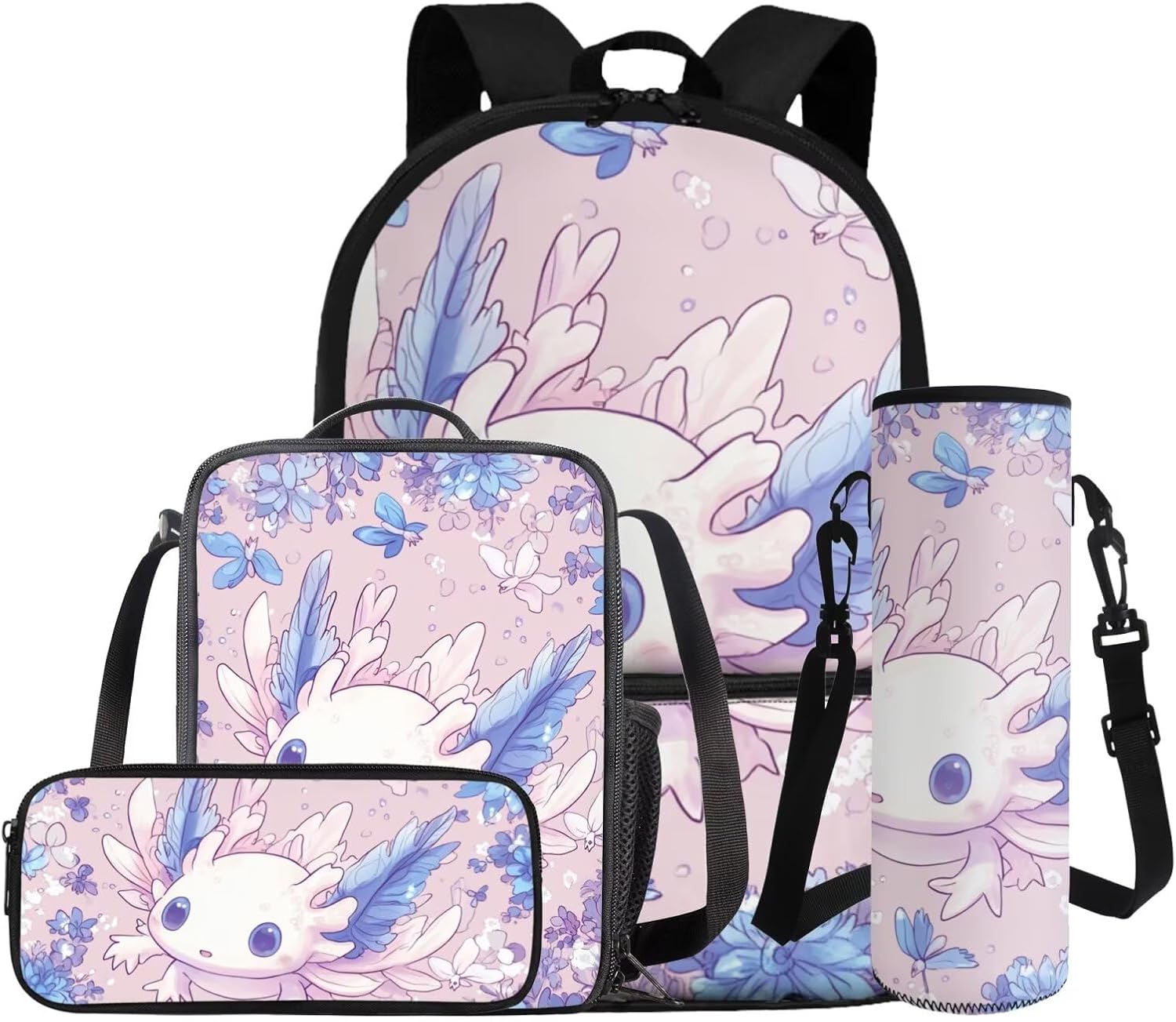 Glorowreny Axolotl Backpack Purse 17 Inch Starry Sky Bookbag and Lunch Box Set for Girls 4 in 1 Pratical Kawaii Camping Lunch Bags with Side Drink Pocket