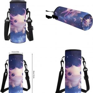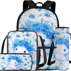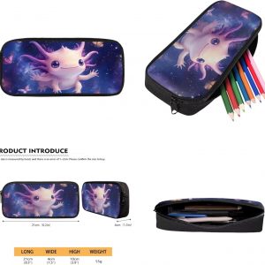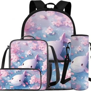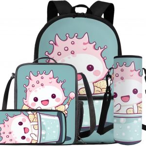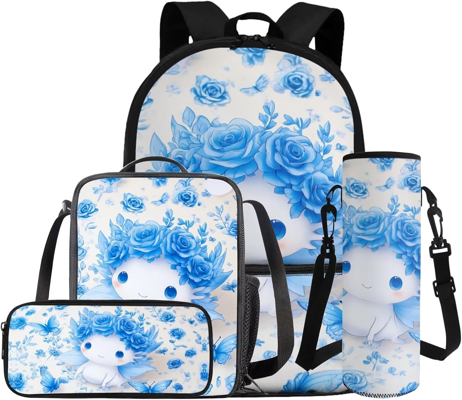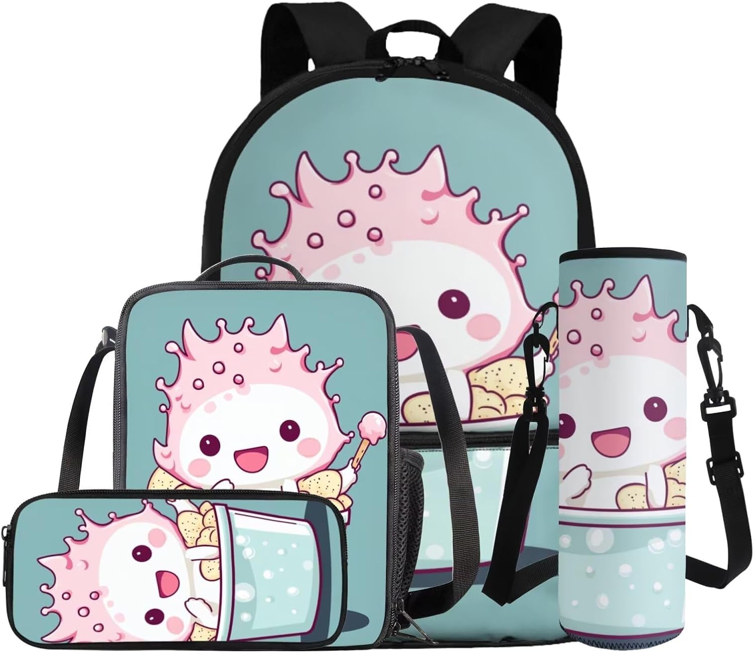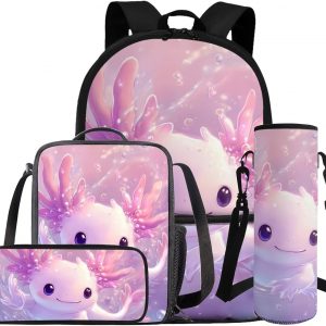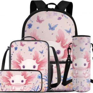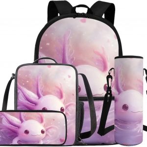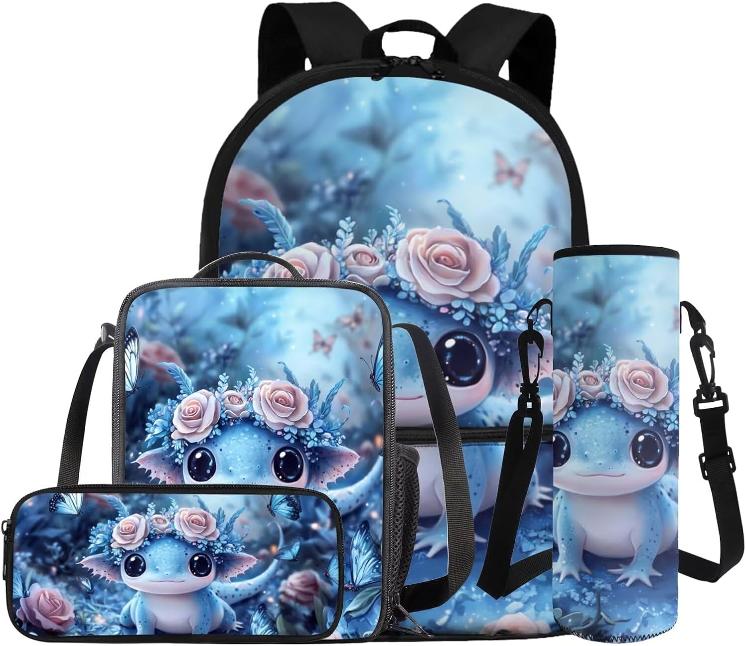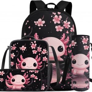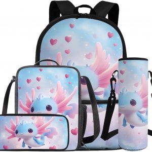 Glorowreny Axolotl Backpack Purse 17 Inch Starry Sky Bookbag and Lunch Box Set for Girls 4 in 1 Pratical Kawaii Camping Lunch Bags with Side Drink Pocket
