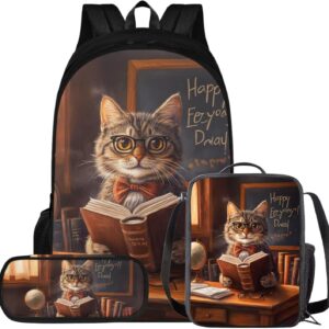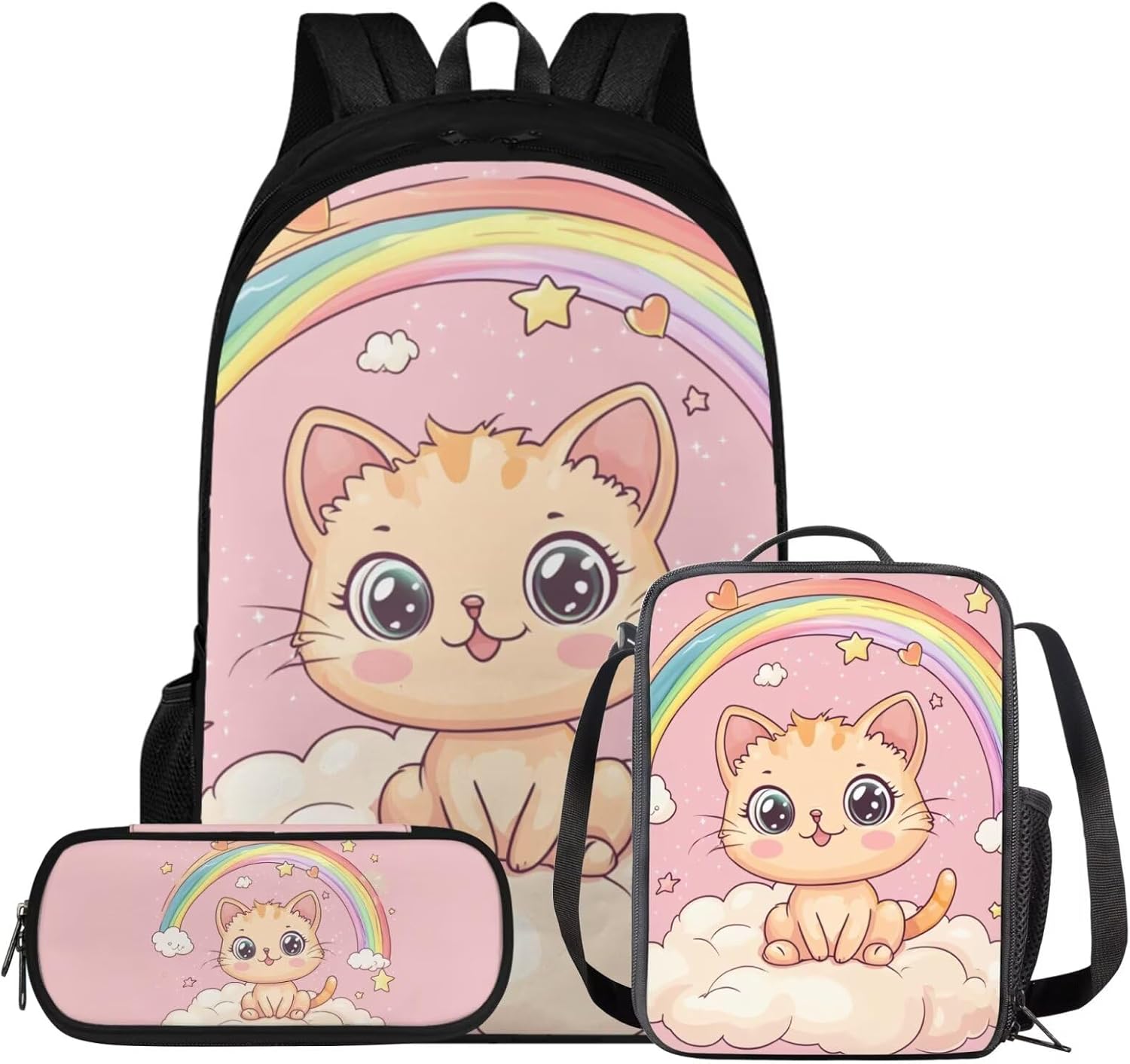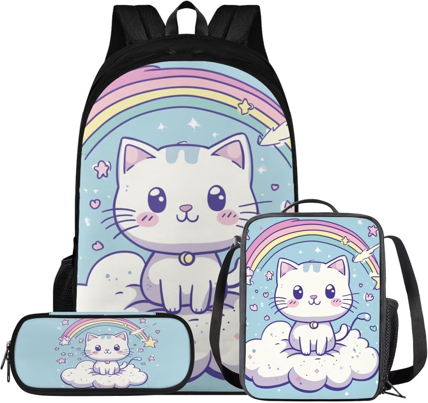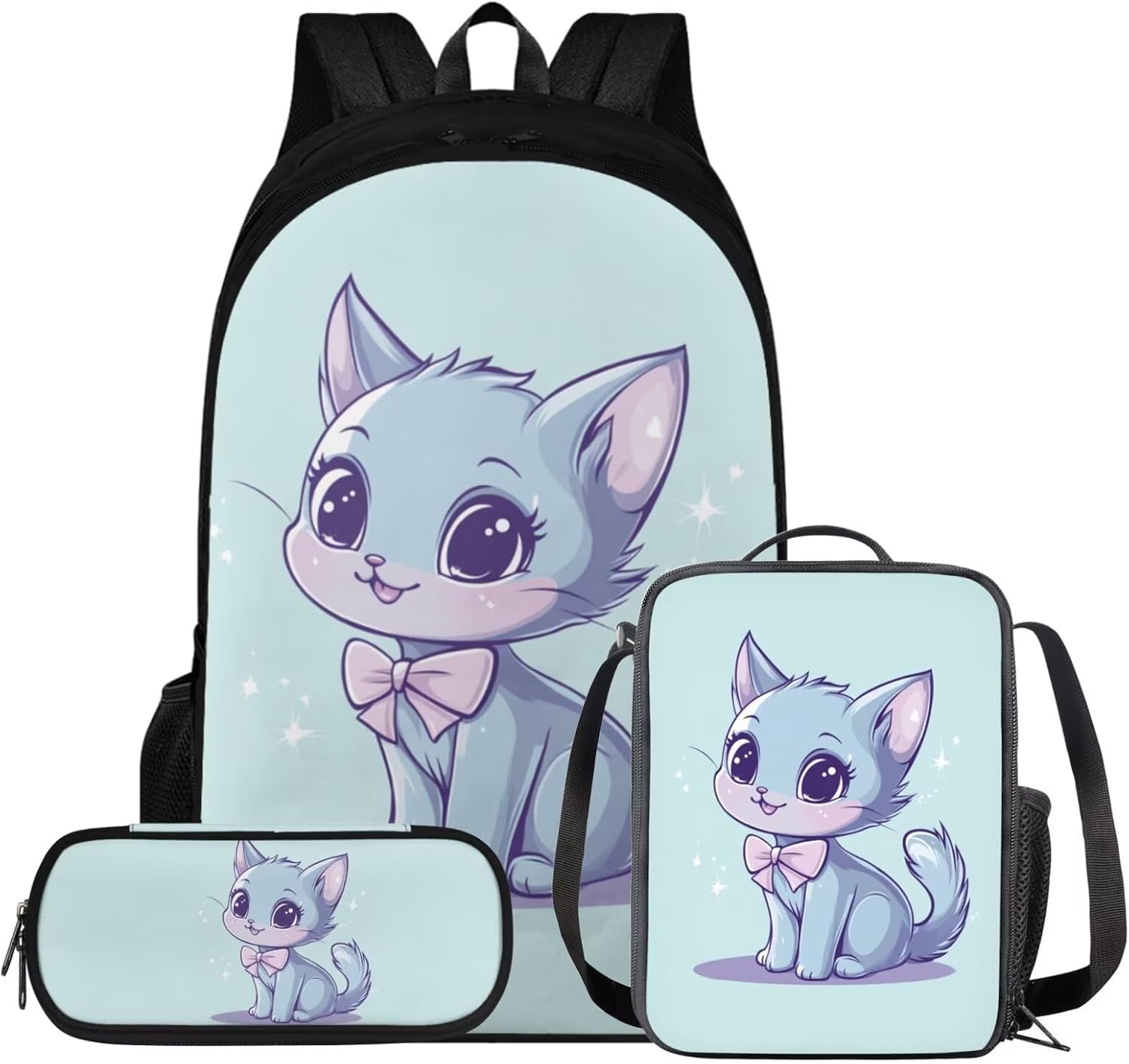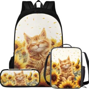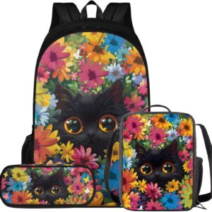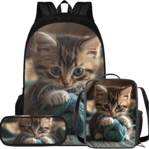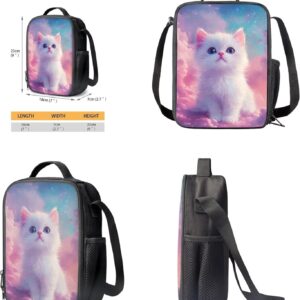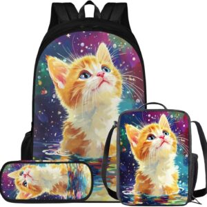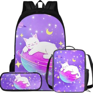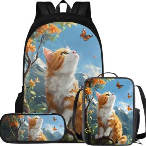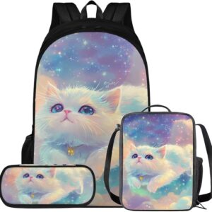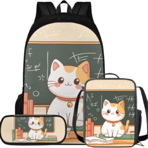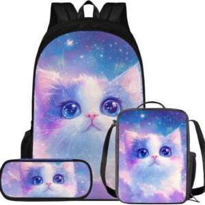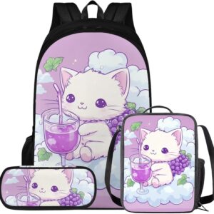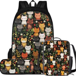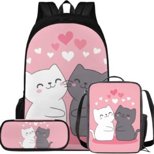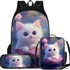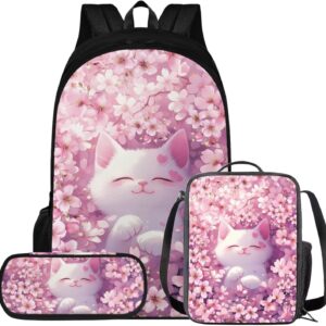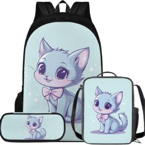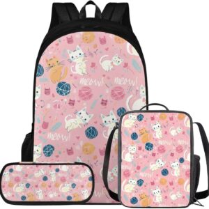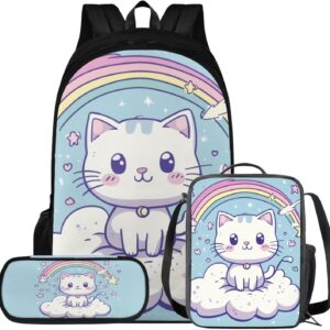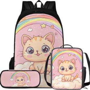 Glorowreny Cat Backpack for Kids School Lightweight 17 Inch Bookbag for Teen Girls with Lunch Box Kawaii Insulated Lunch Bag with Pockets 3 Pcs Back to School Gifts