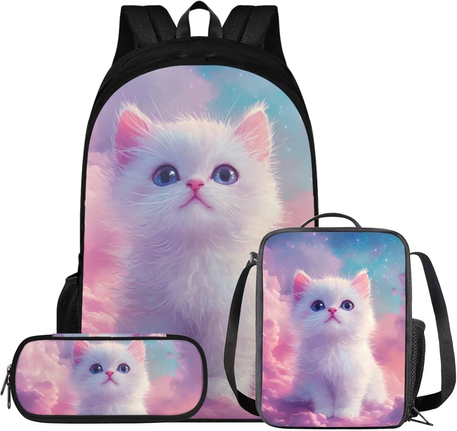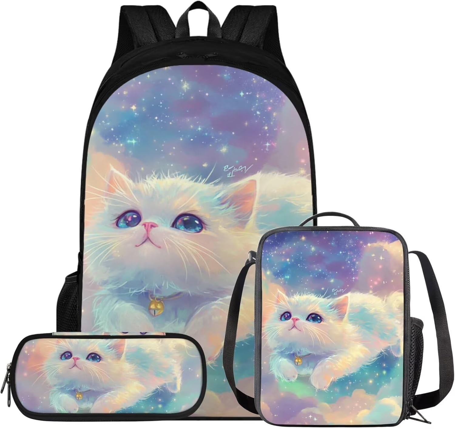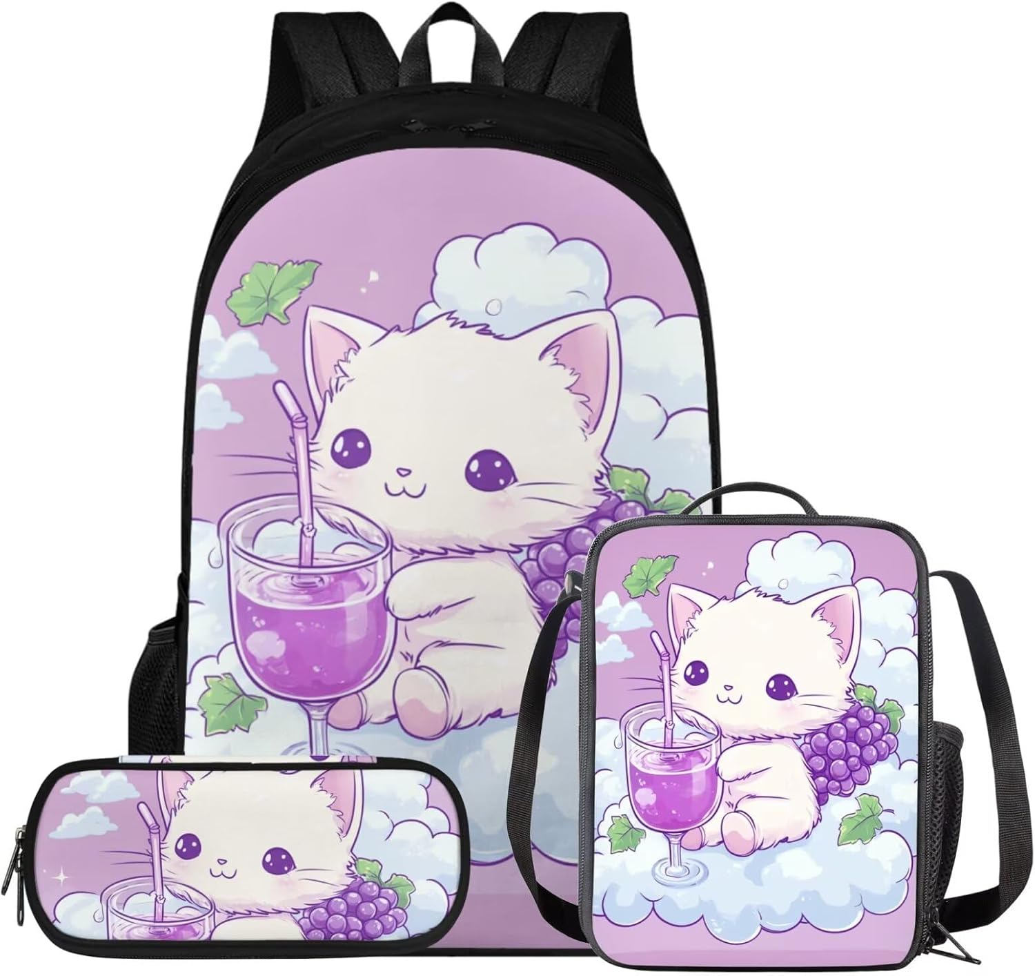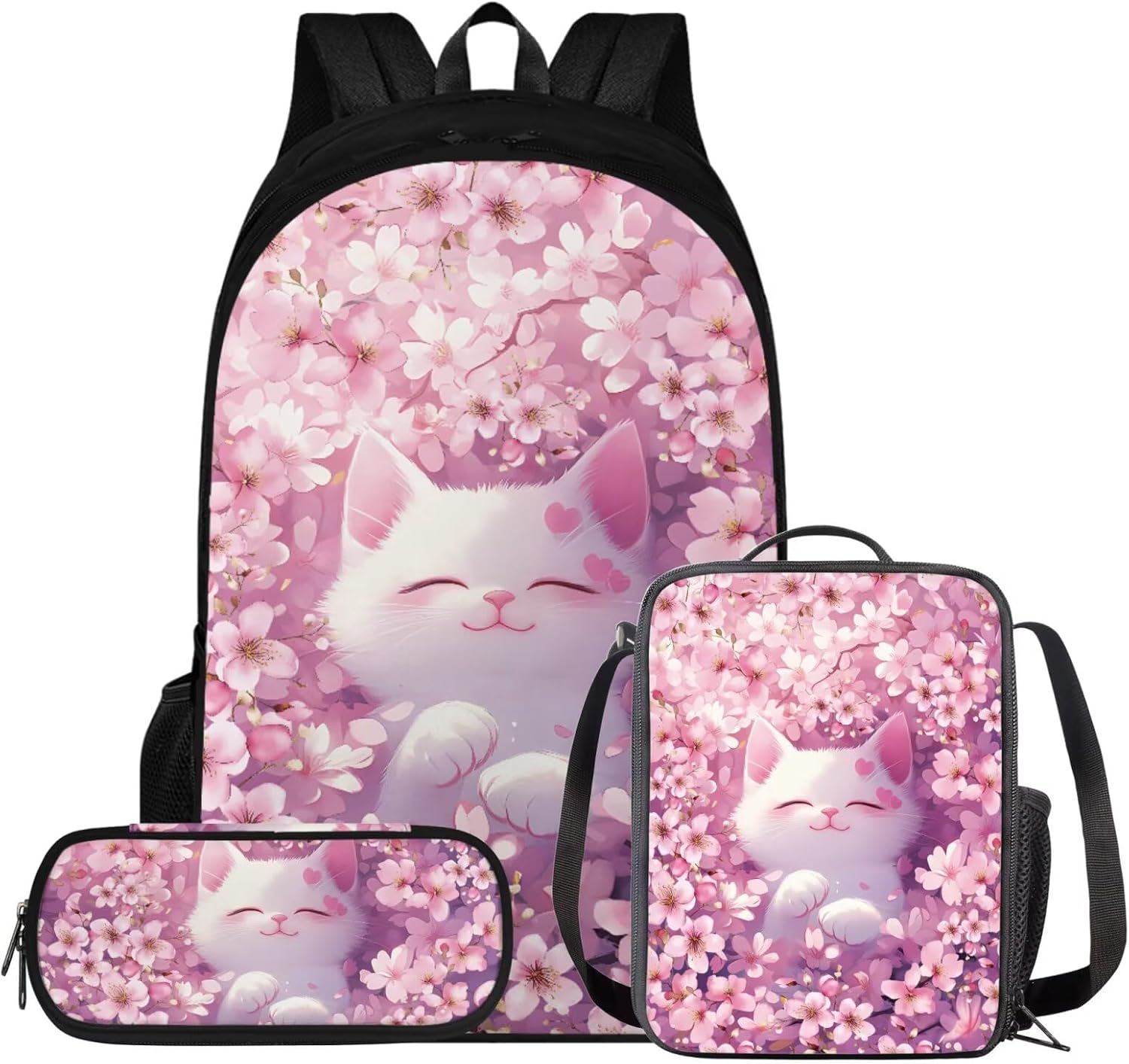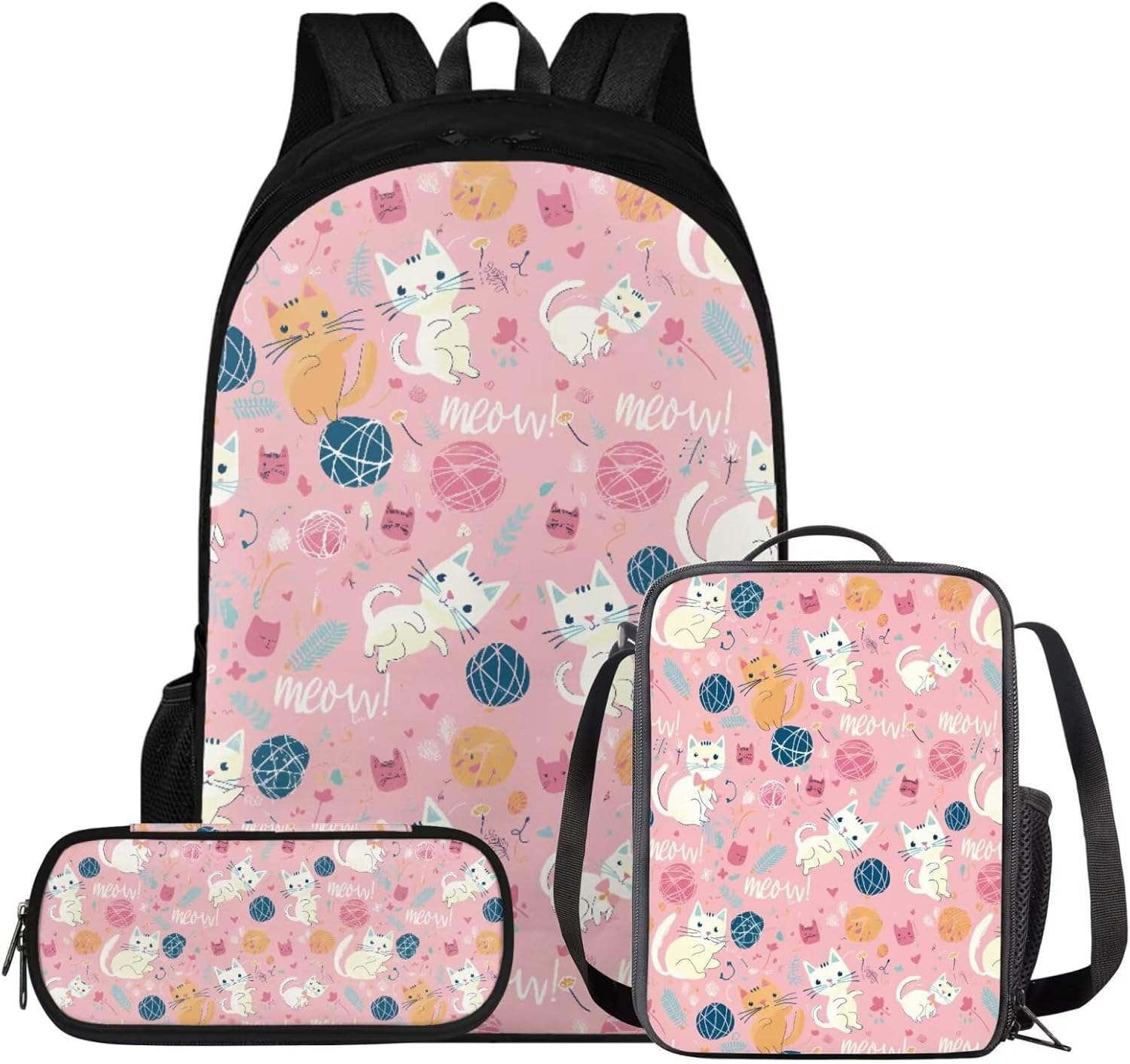 Glorowreny Cat Backpack for Kids School Lightweight 17 Inch Bookbag for Teen Girls with Lunch Box Kawaii Insulated Lunch Bag with Pockets 3 Pcs Back to School Gifts