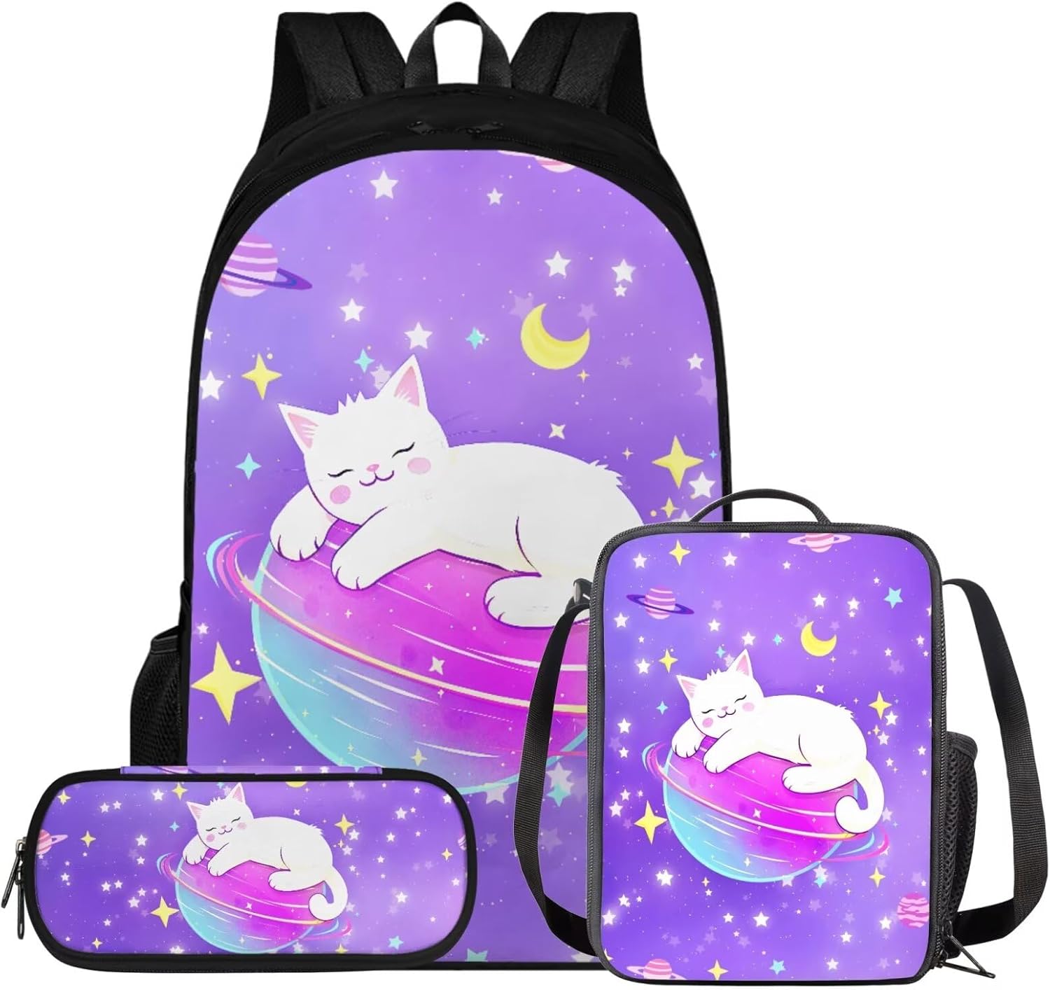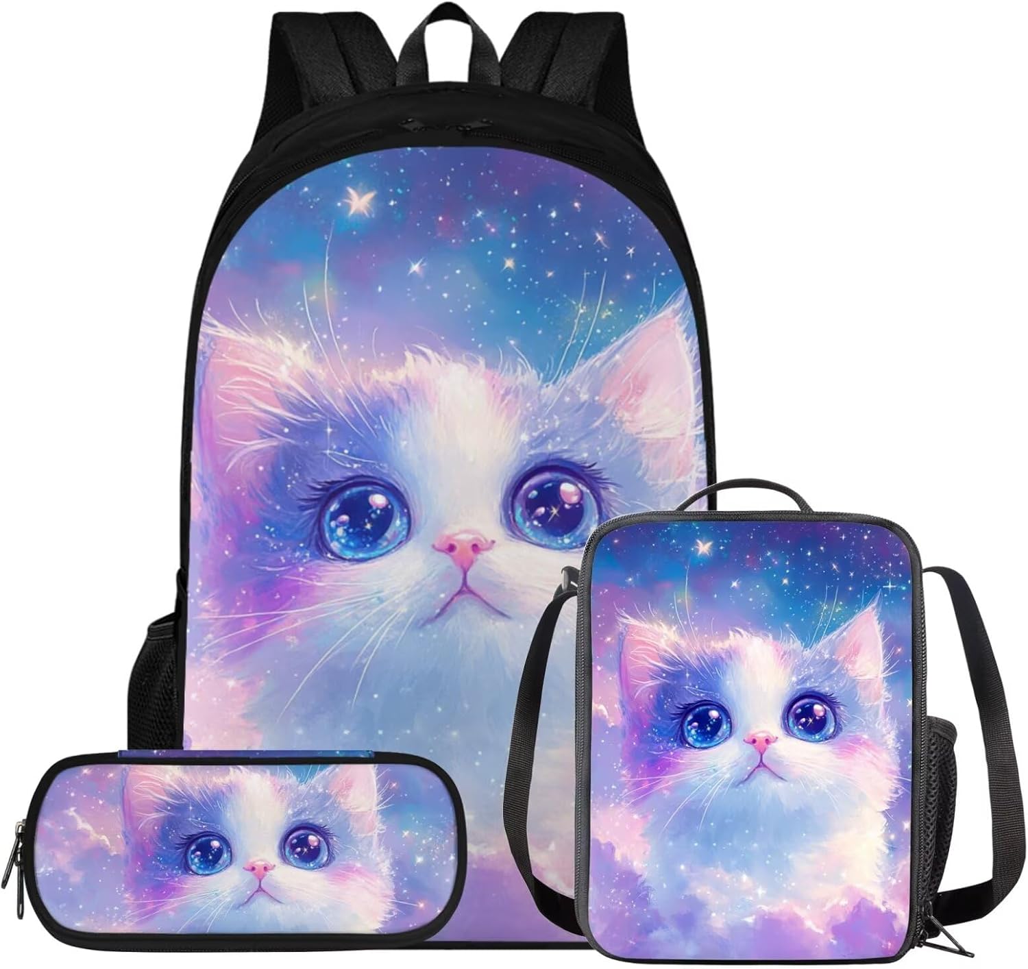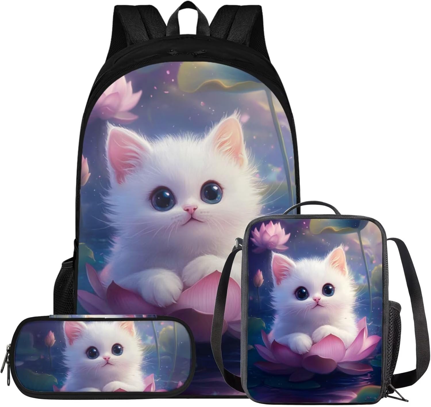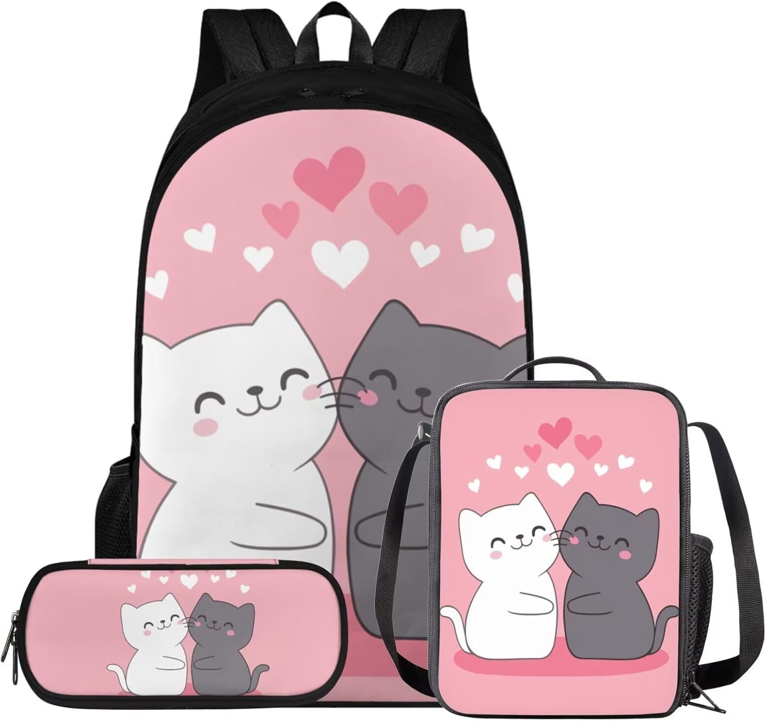 Glorowreny Cat Backpack for Kids School Lightweight 17 Inch Bookbag for Teen Girls with Lunch Box Kawaii Insulated Lunch Bag with Pockets 3 Pcs Back to School Gifts