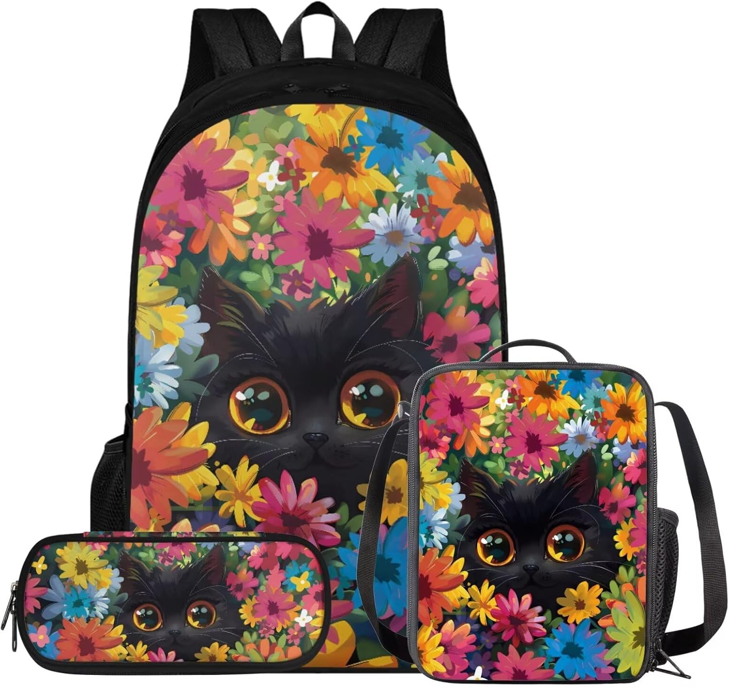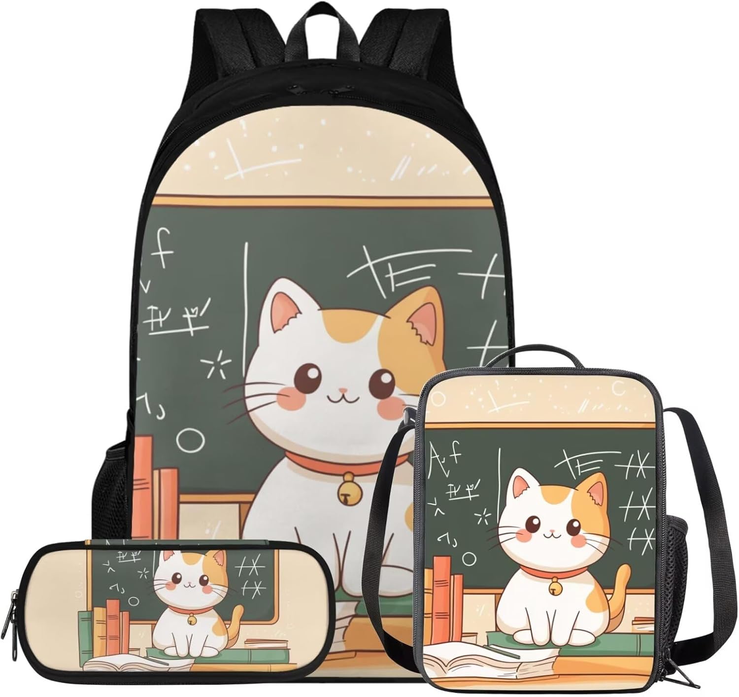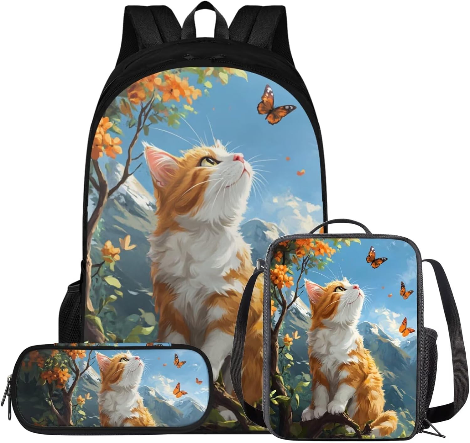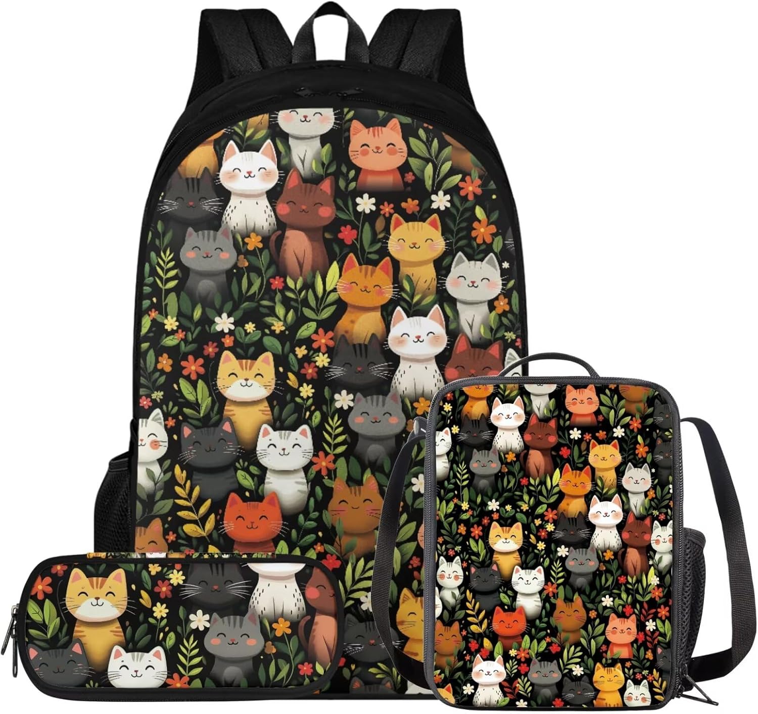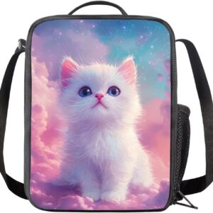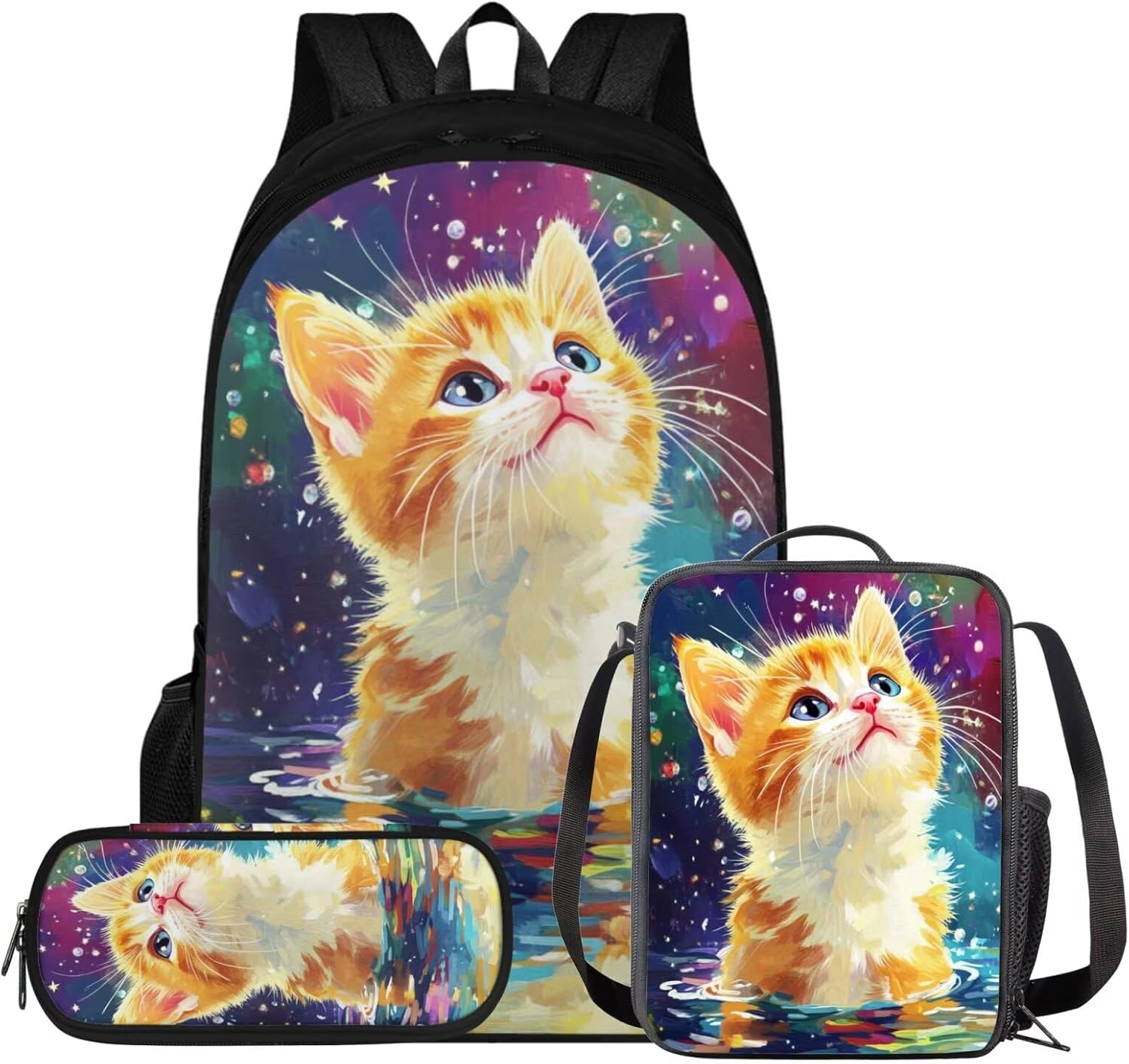Glorowreny Cat Backpack for Kids School Lightweight 17 Inch Bookbag for Teen Girls with Lunch Box Kawaii Insulated Lunch Bag with Pockets 3 Pcs Back to School Gifts