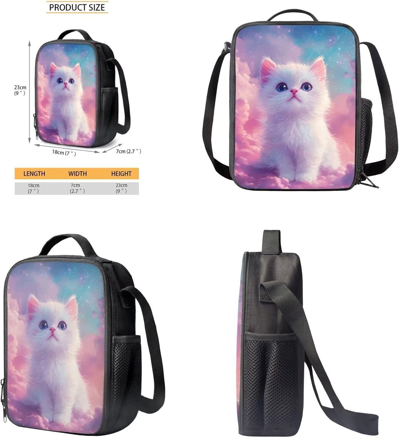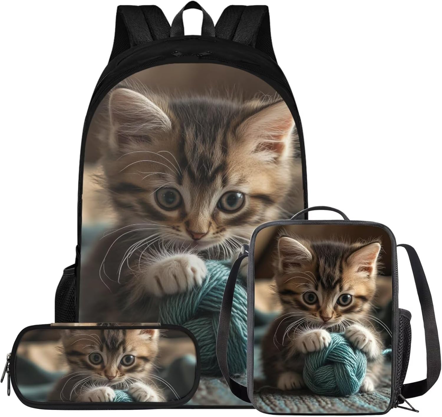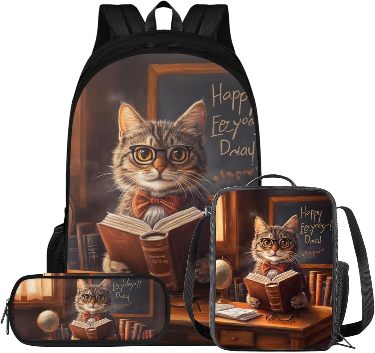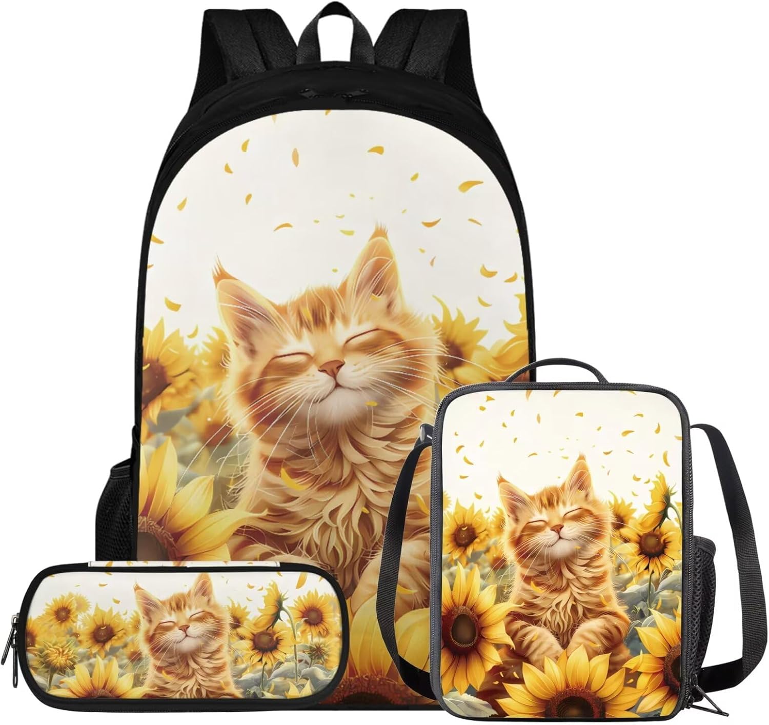 Glorowreny Cat Backpack for Kids School Lightweight 17 Inch Bookbag for Teen Girls with Lunch Box Kawaii Insulated Lunch Bag with Pockets 3 Pcs Back to School Gifts