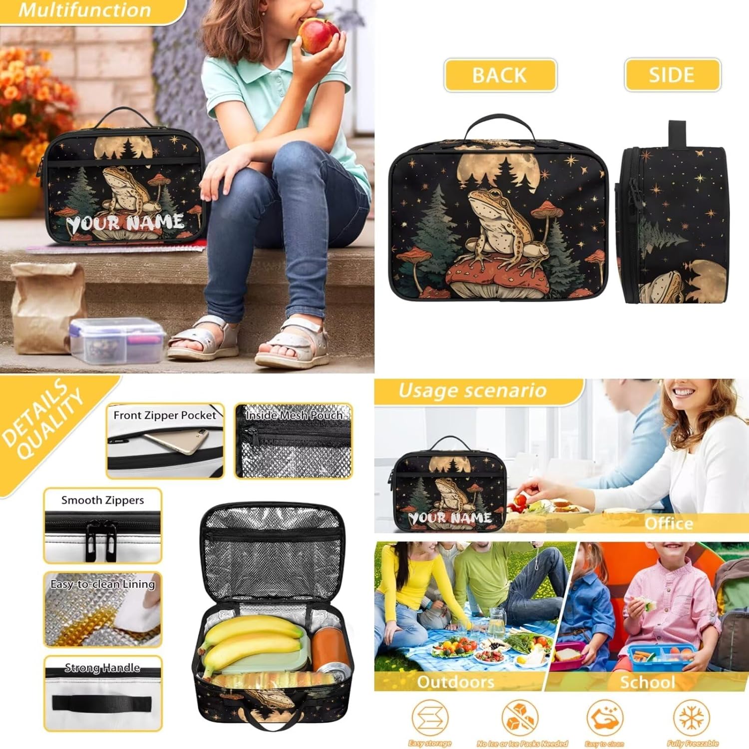 Our this lunch bag is made of polyester fabric with an anti-spill inner layer. The material is soft and comfortable, double zips with 1 mesh bottle pocket on one side, adjustable shoulder strap, internal elastic strap to secure small fork, knife and spoon handles, can be handheld or slung over one shoulder.