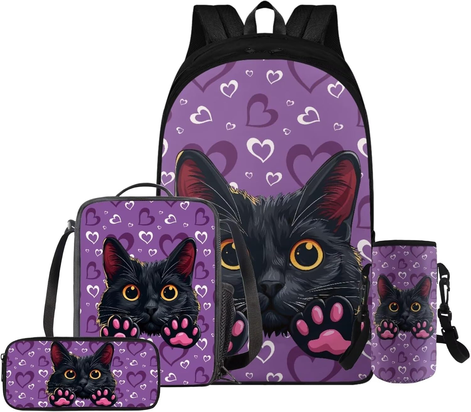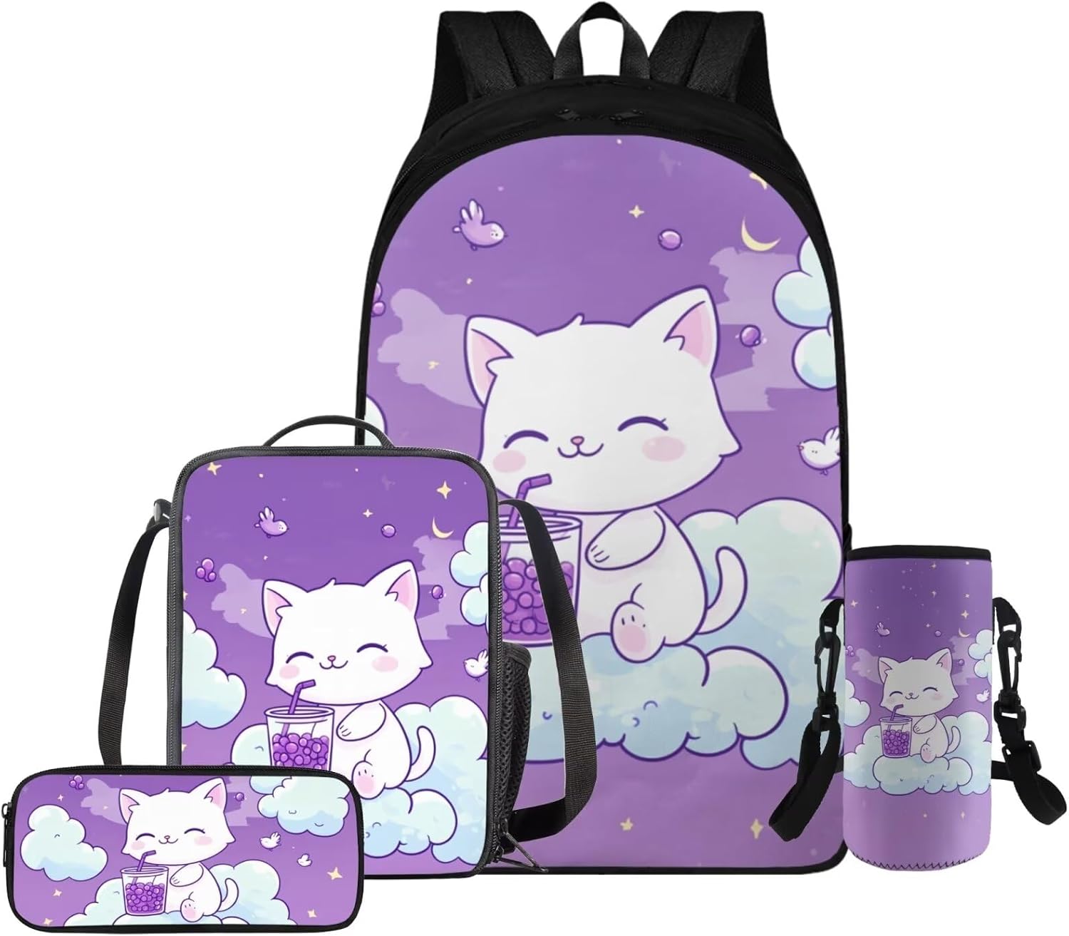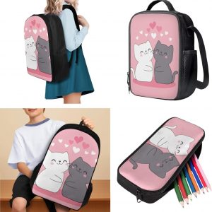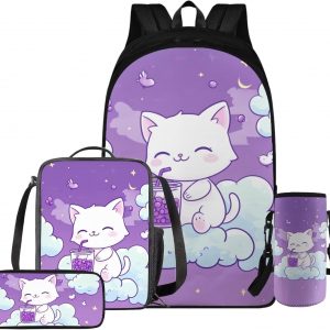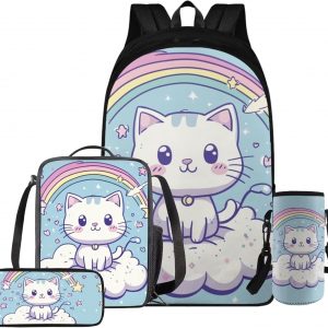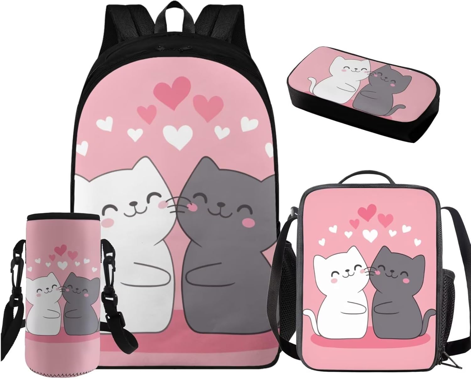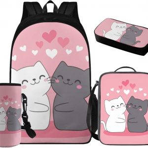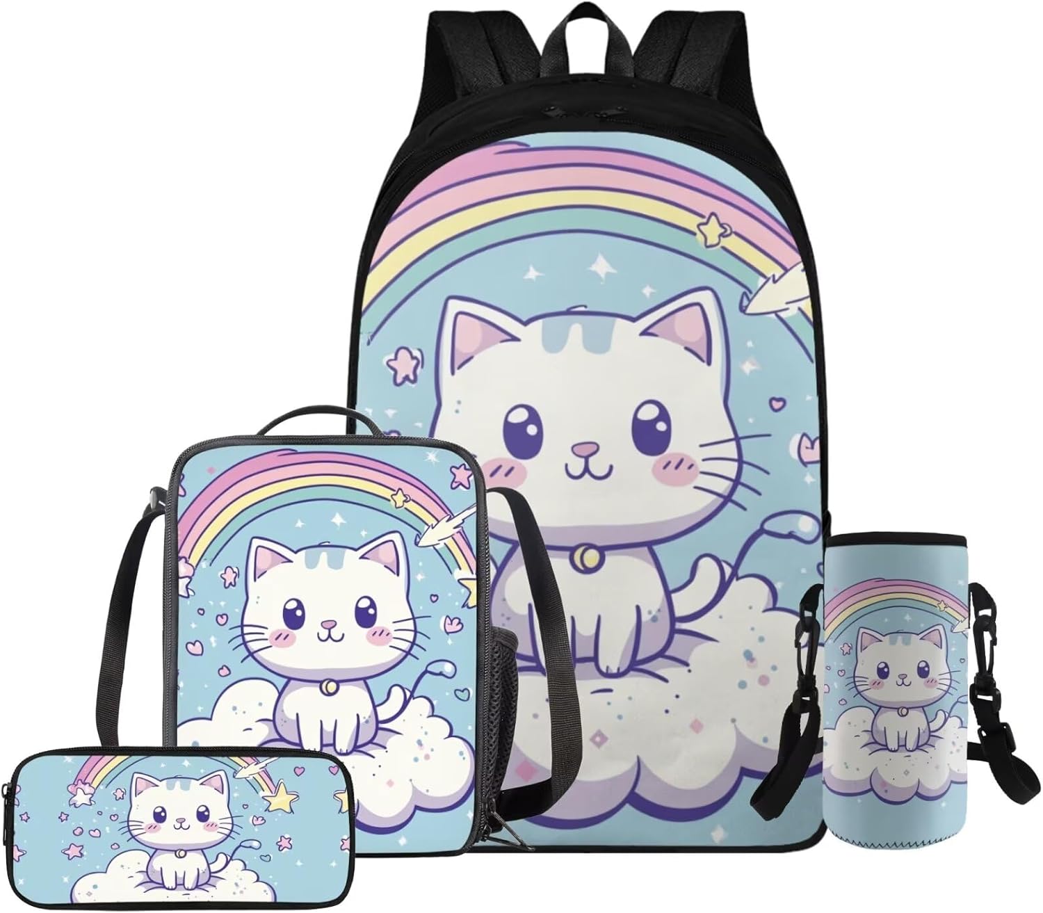 Rnyleeg Pink Cat Backpack for School Girls 9-12 with Lunch Box Kawaii Kids Backpack Set Middle School Bookbag Set 4 in 1 Kids School Bag Rucksack quantity