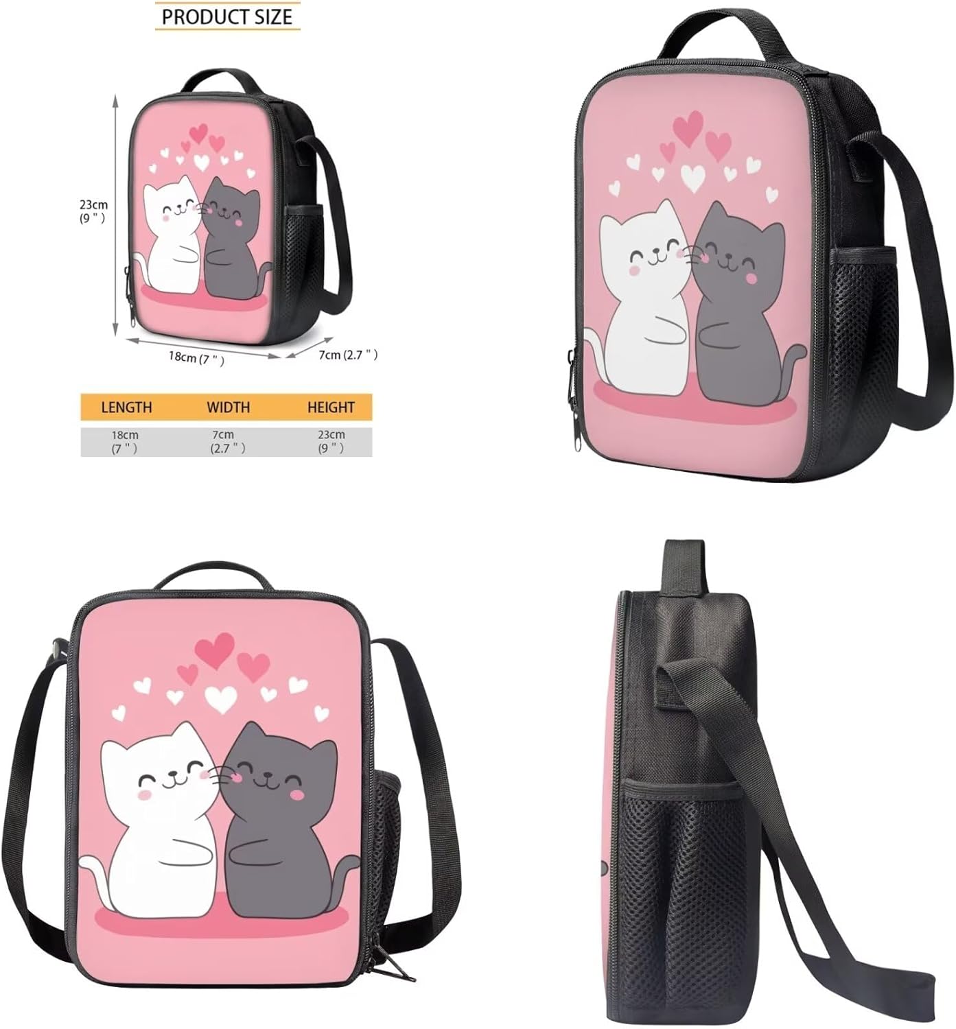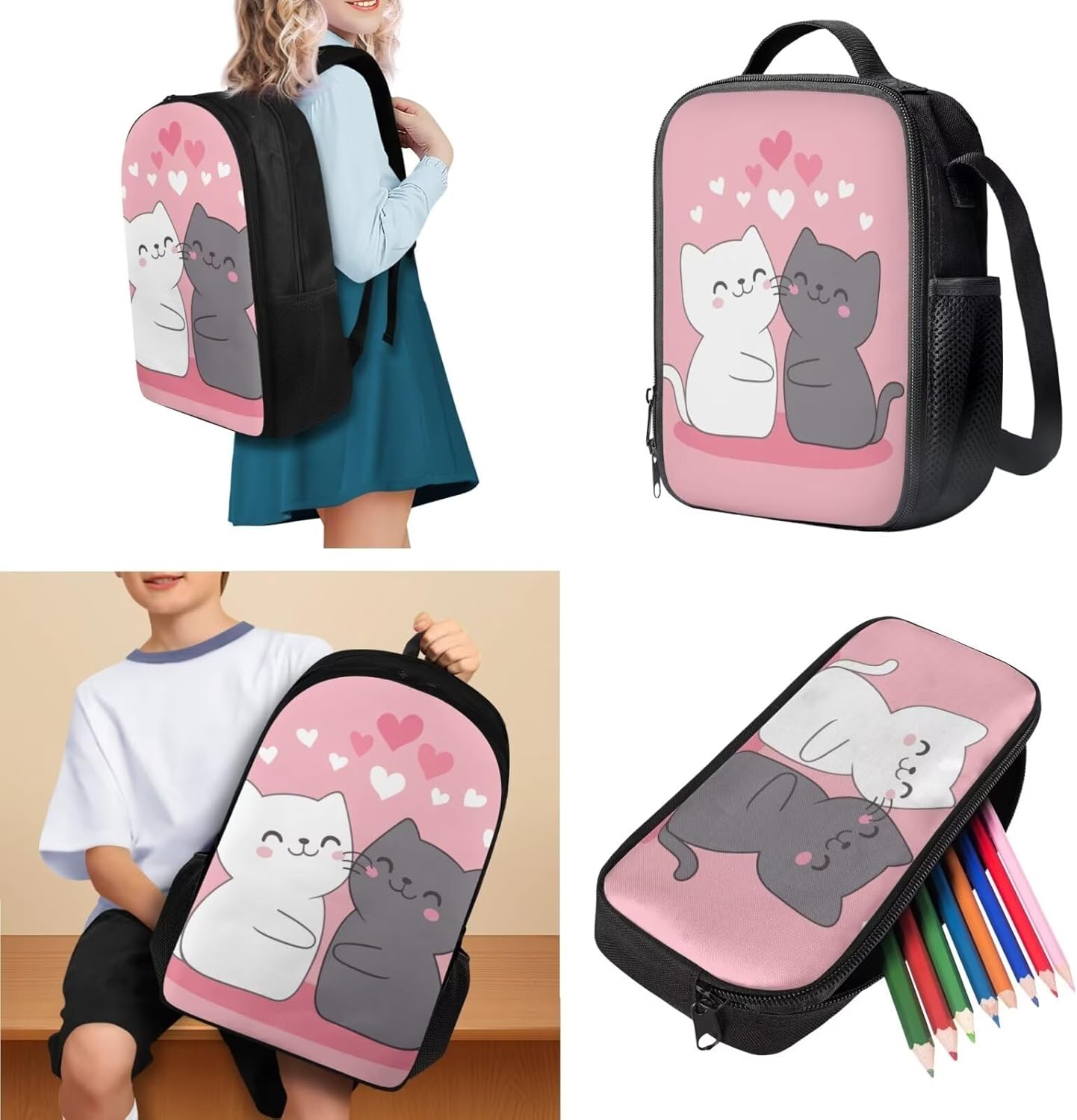 Rnyleeg Pink Cat Backpack for School Girls 9-12 with Lunch Box Kawaii Kids Backpack Set Middle School Bookbag Set 4 in 1 Kids School Bag Rucksack