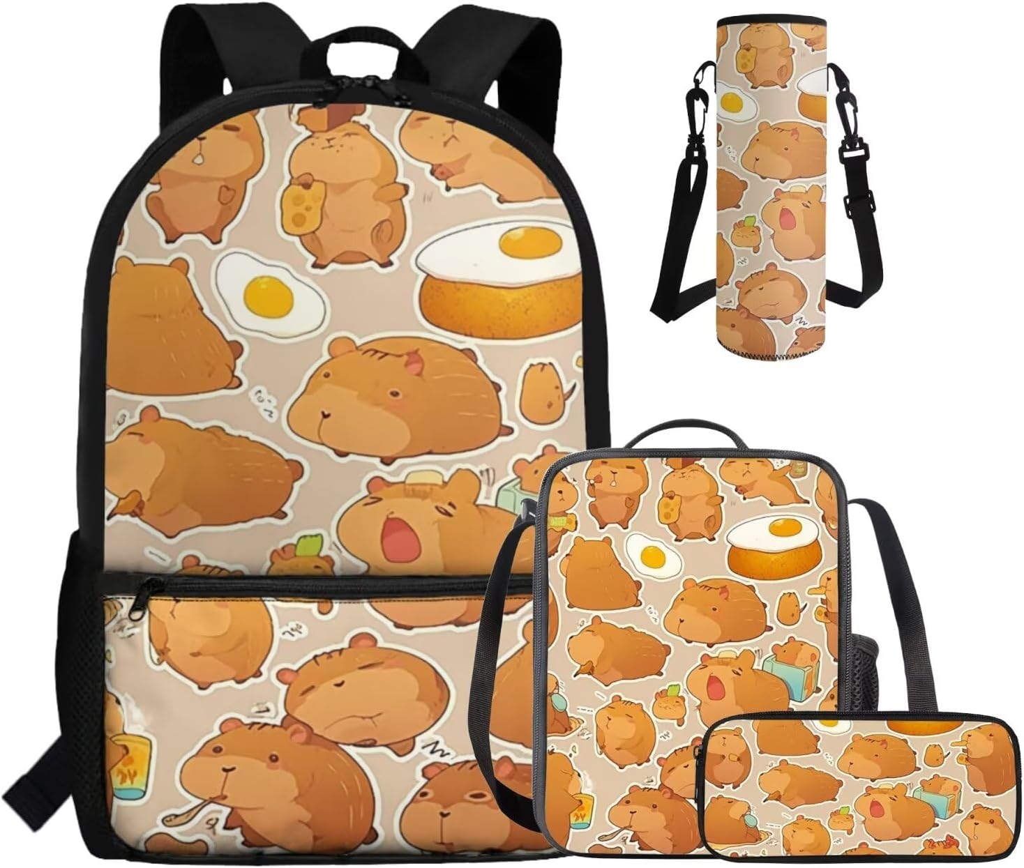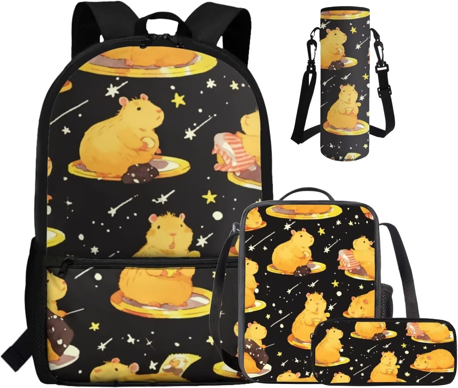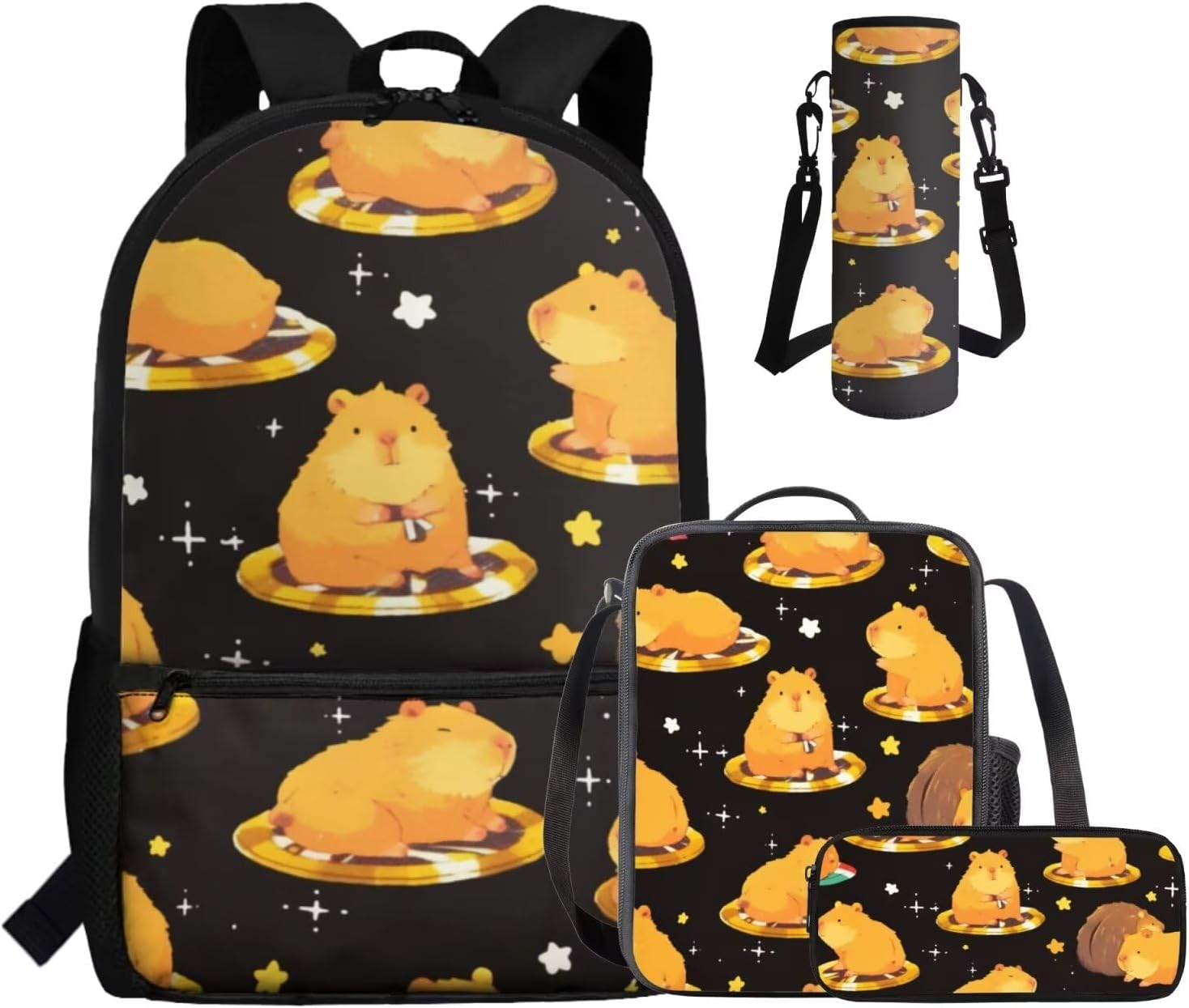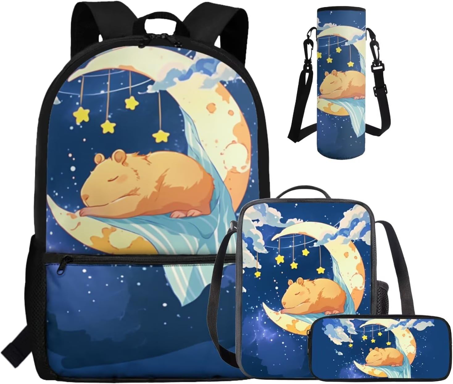 This set includes a spacious 17-inch polyester backpack, a handy lunch bag, a practical pen bag, and a convenient water cup sleeve. From carrying books, water cup to keeping food fresh and stationery organized, it covers all bases. All crafted to make school days easier and more enjoyable.