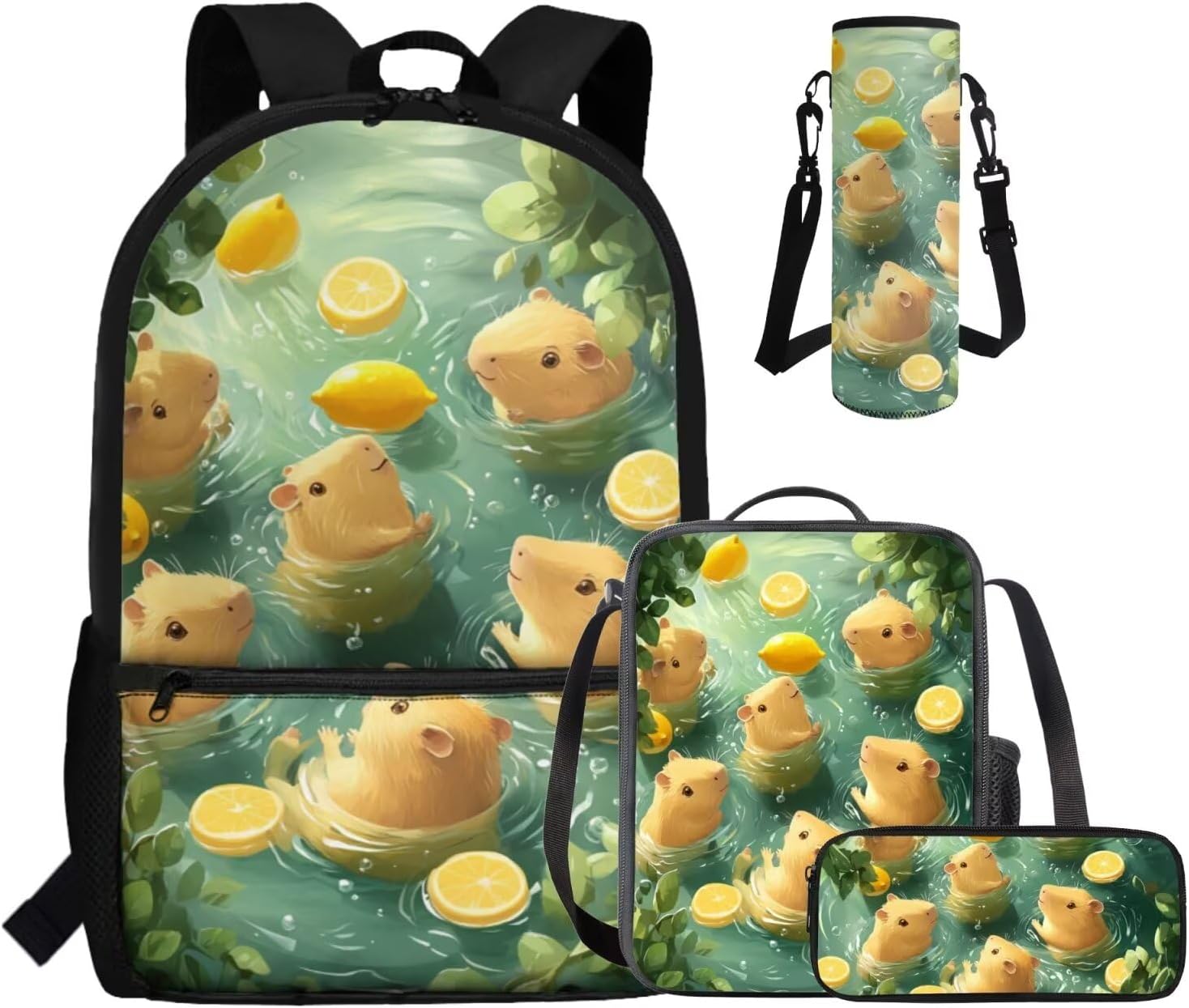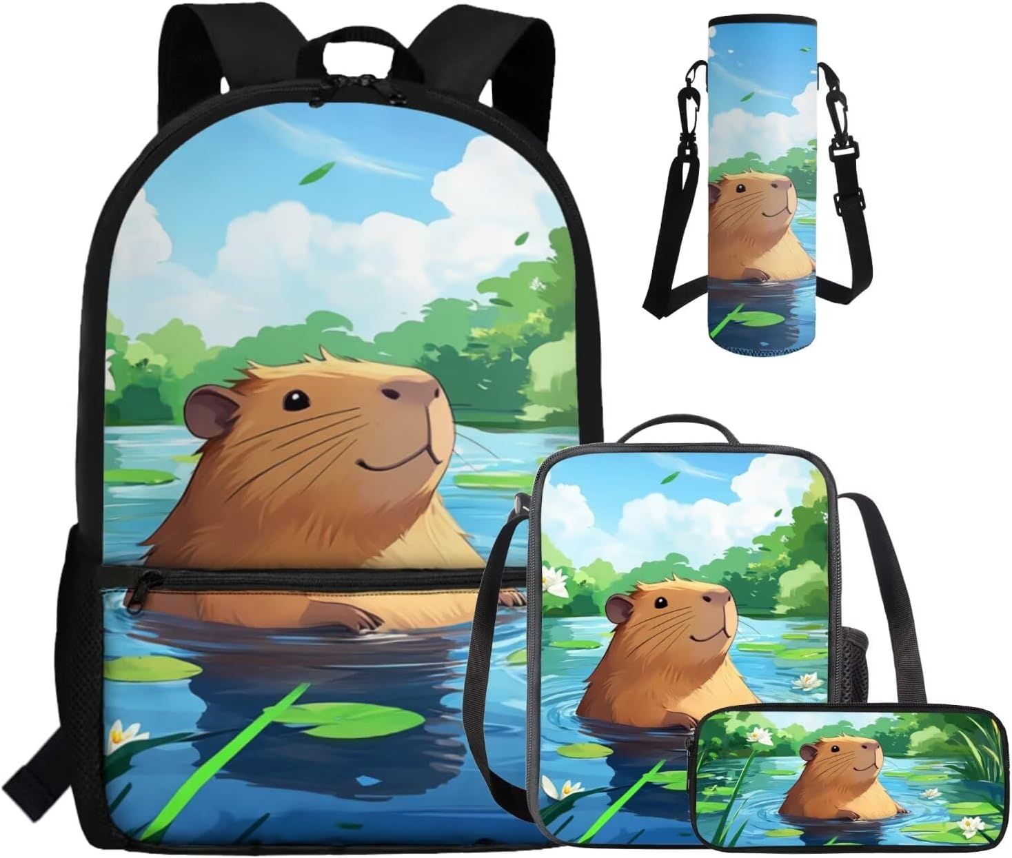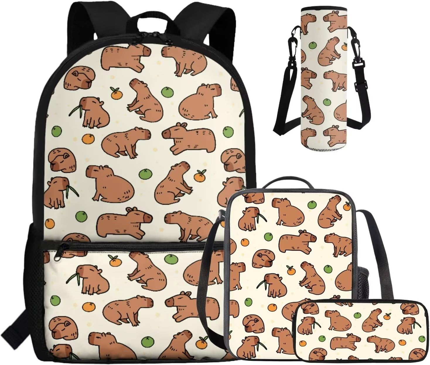 - Large Capacity School Bag Set: The stylish bookbag has a zippered compartment that can store books, textbooks, phones, etc. in an orderly manner, and there is an inner pocket for storing small items, and two side mesh pockets for storing water bottles or umbrellas; The lunch bag has double zippers and one mesh bottle pocket on one side; The pen pouch keeps pencils and cards organized; The cup sleeve suitable for large water cups