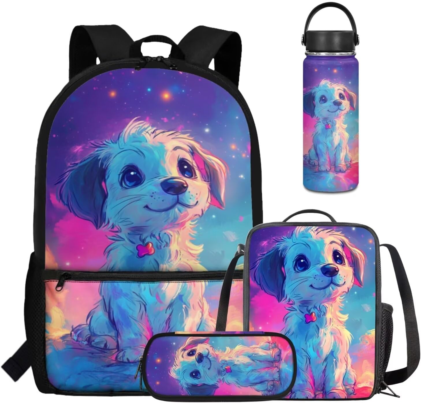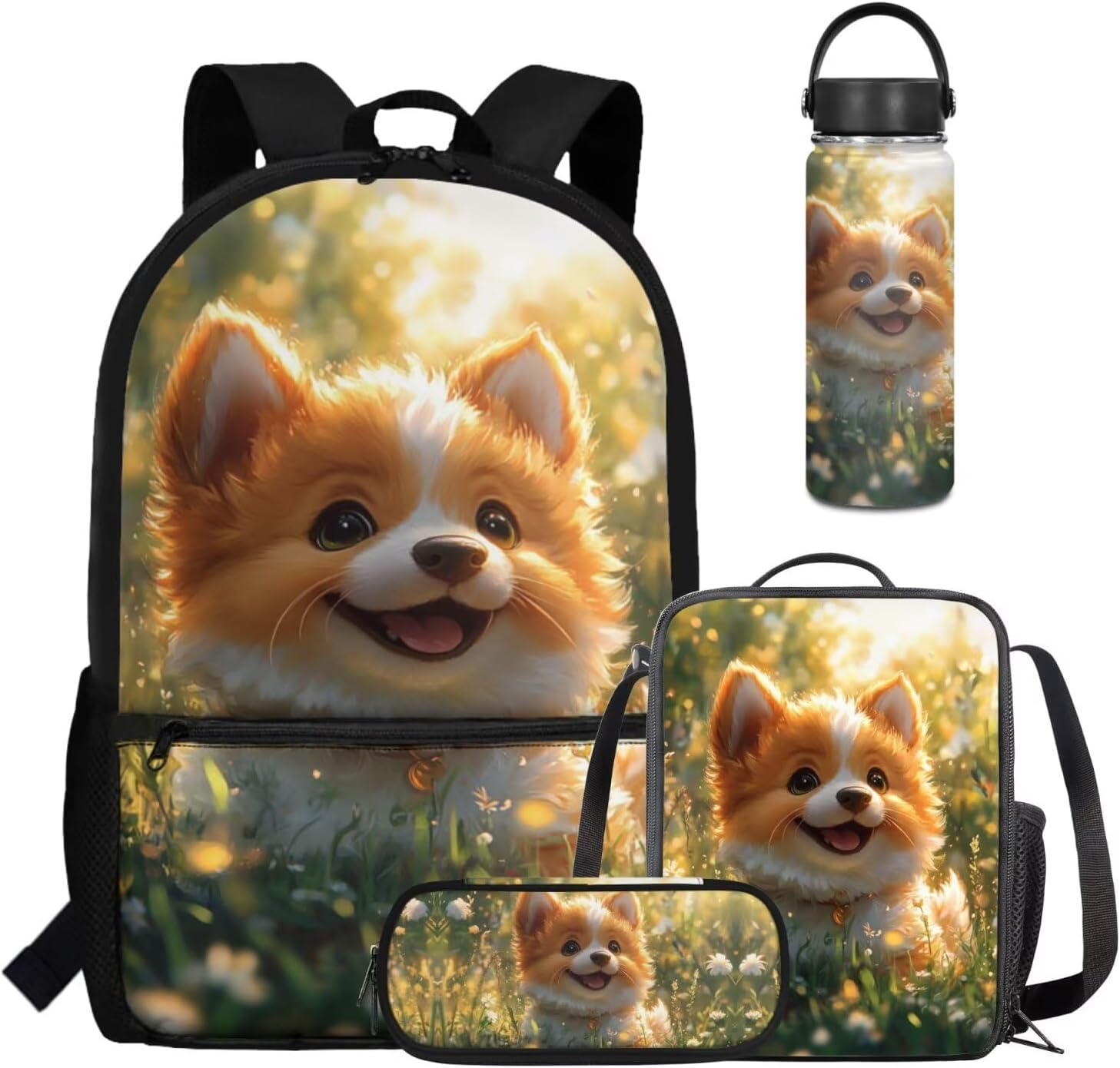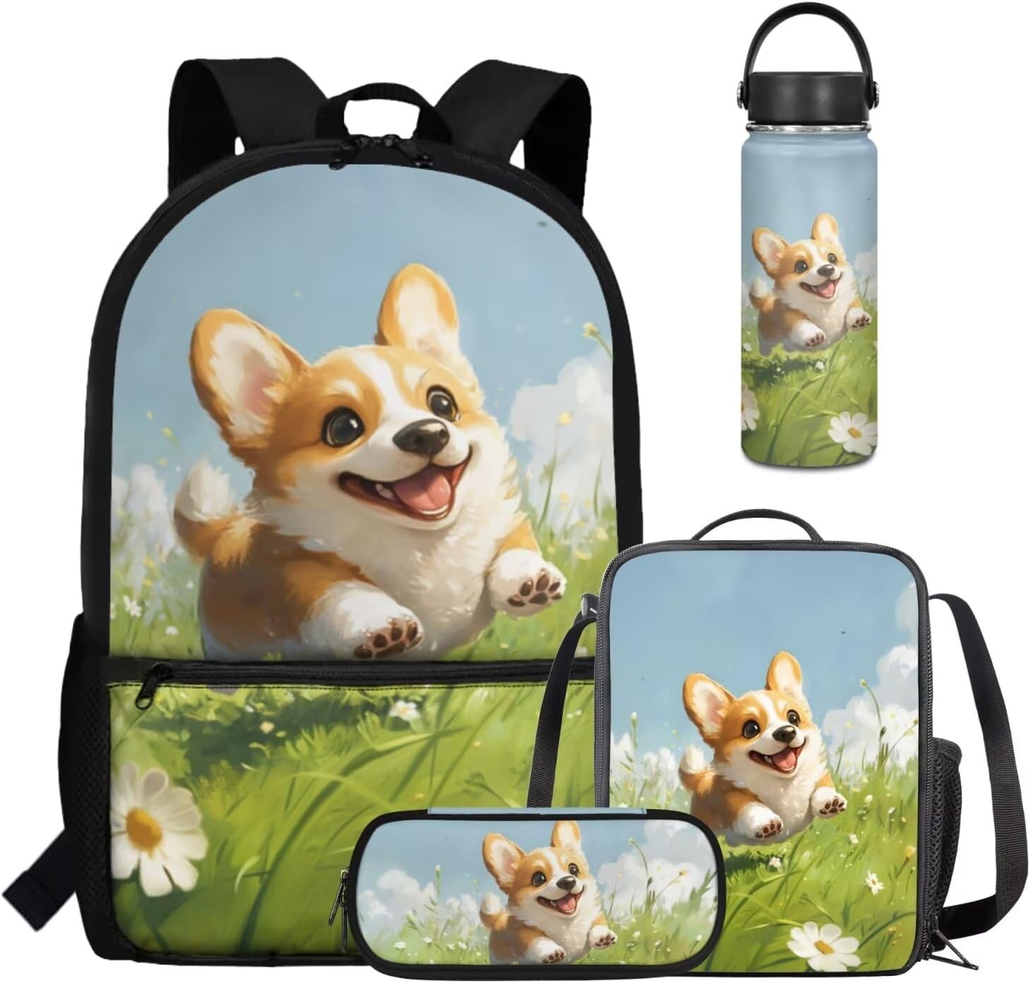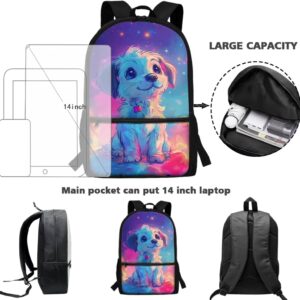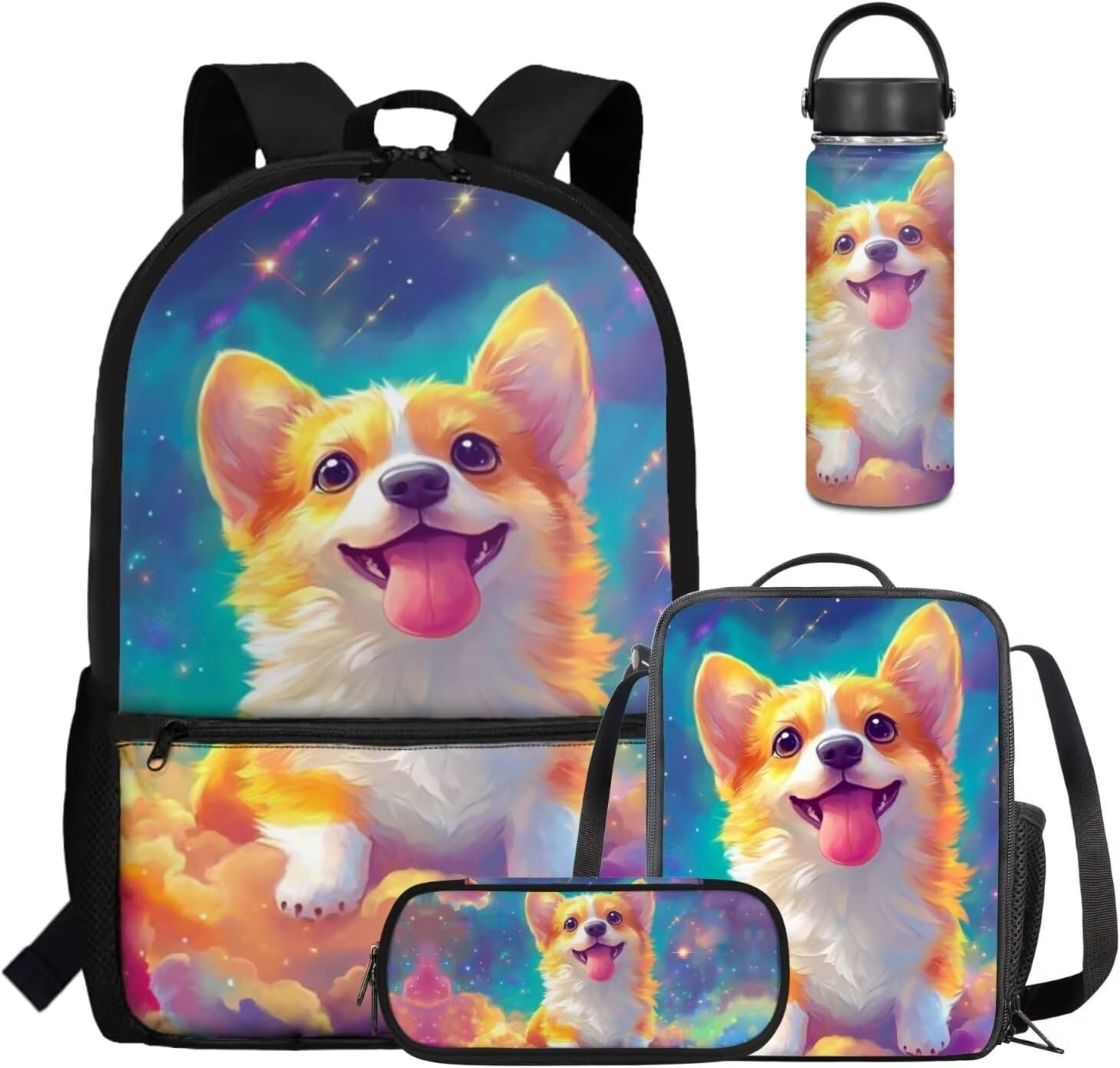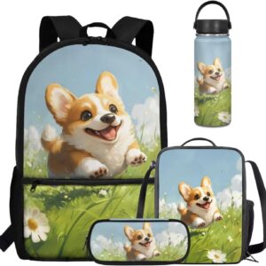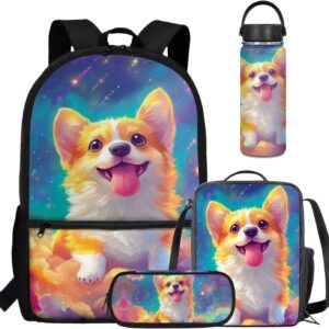 Viewamoon 4 In 1 Kawaii Dog Backpack for Kids Girls 4-6 with Lunch Box Corgi Space Bookbag for Toddler Middle School Large Capacity School Bag Set for Girls Large Pencil Case for Birthday Gifts