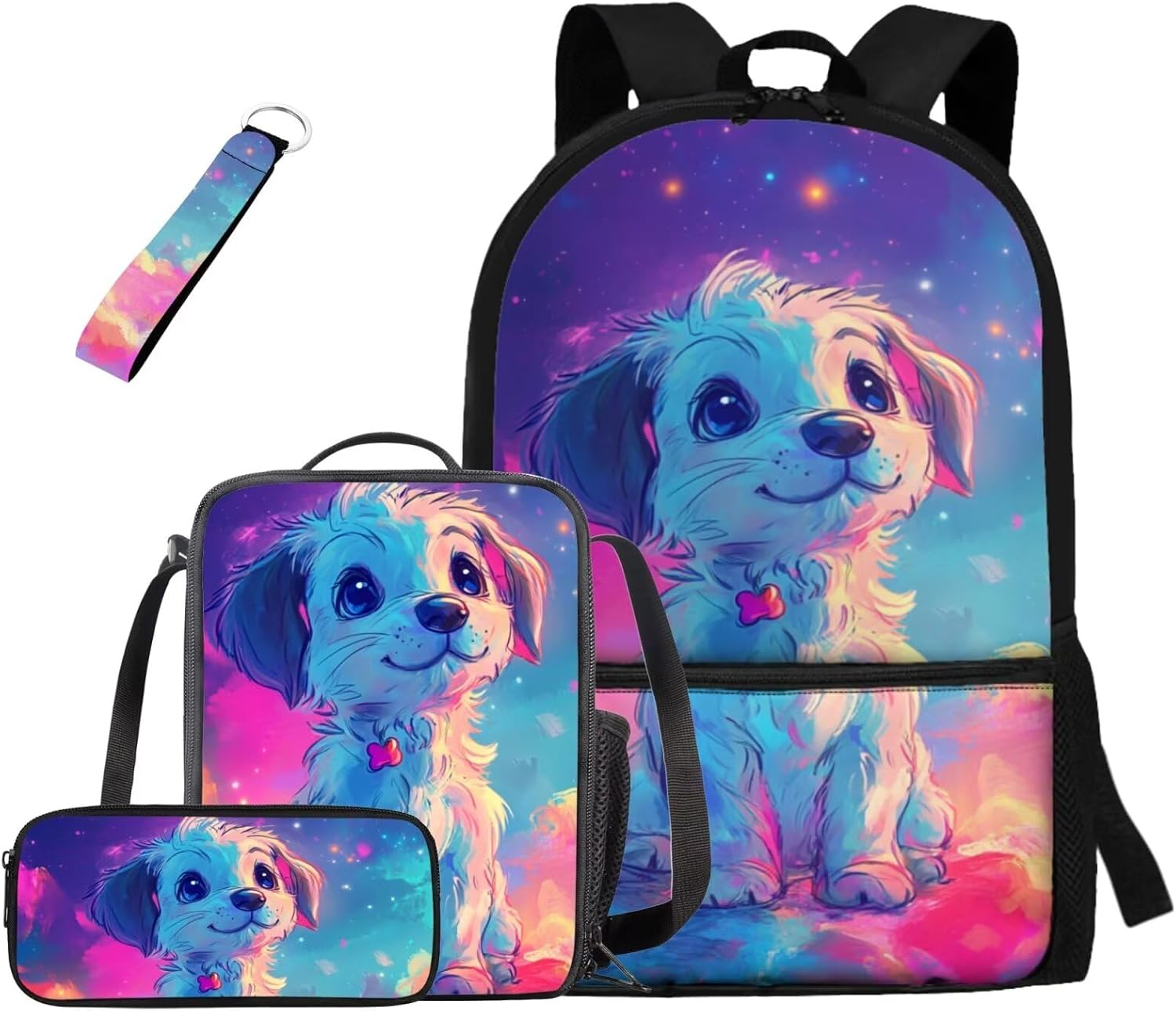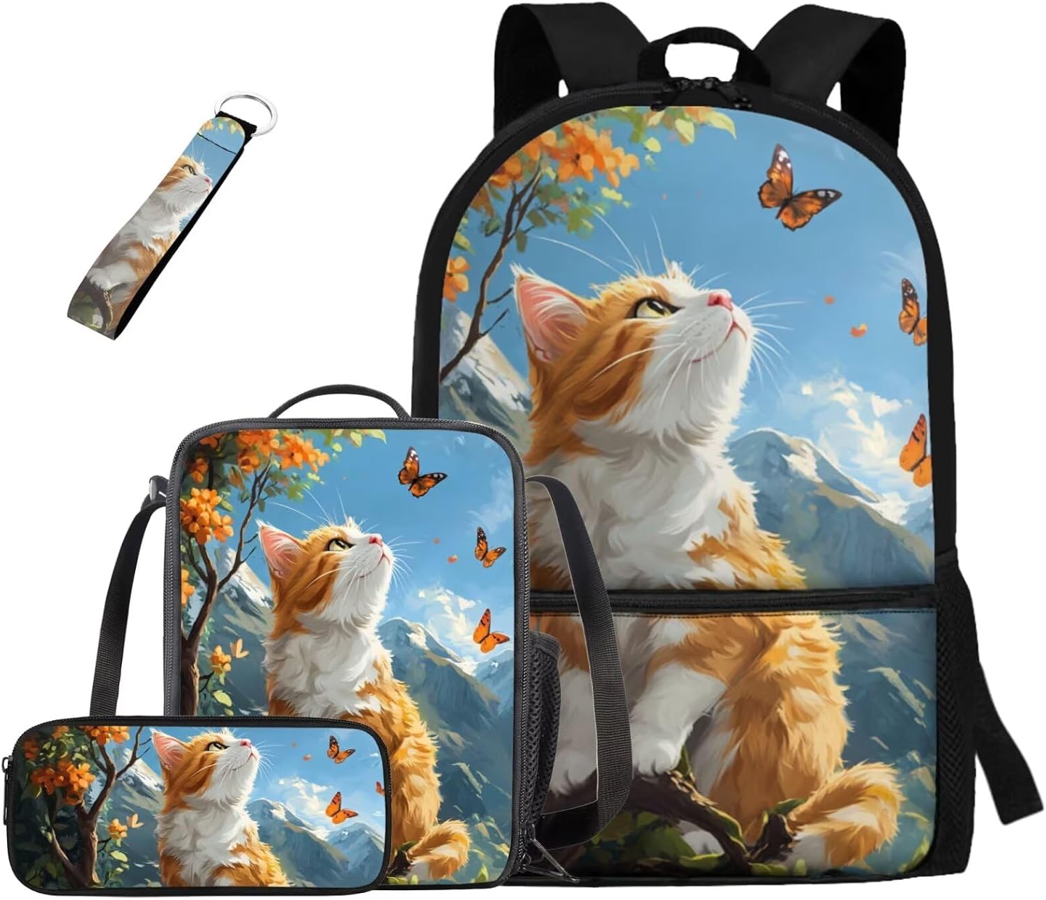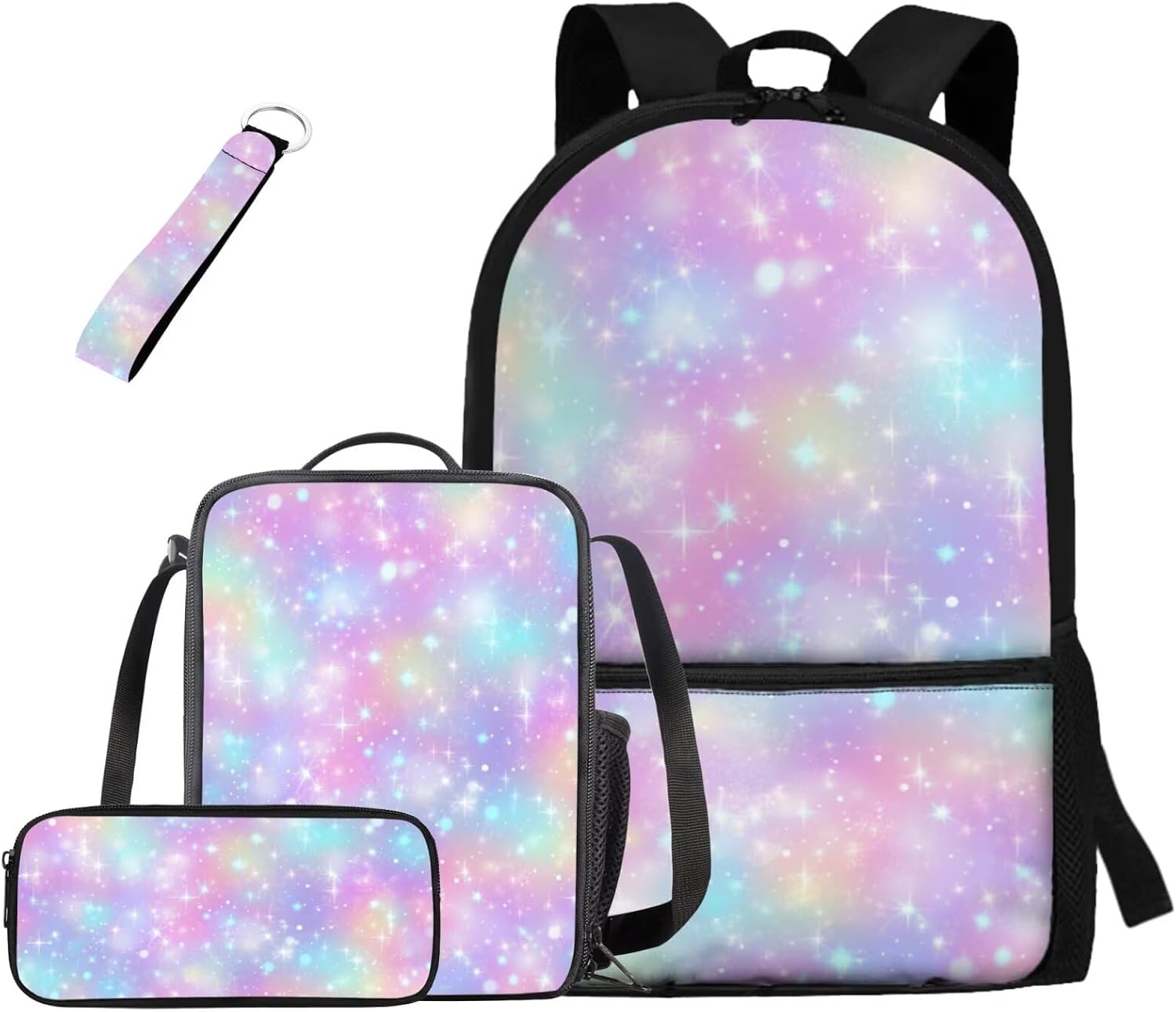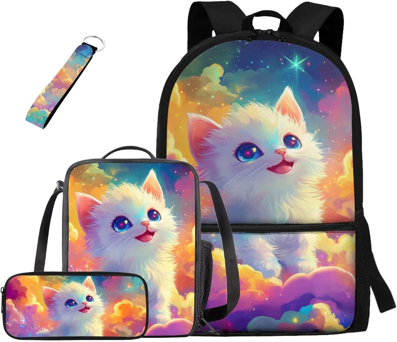 - Multifunctional Design: The 17-inch polyester schoolbag features a spacious main compartment and a front zipper pocket, making it convenient to categorize and store school supplies. The lunch bag is equipped with an insulating lining to keep the food fresh. The pen case is easy to store stationery. The Keychain can connects to the keys, smart key, wallet and bookbag